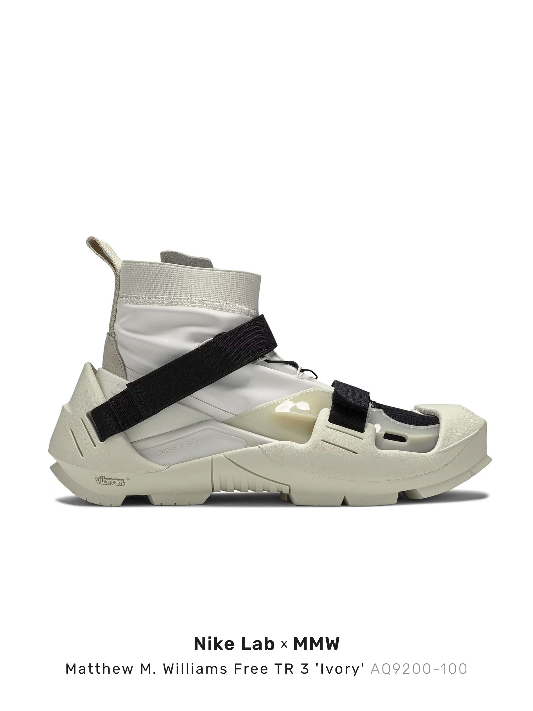 Matthew M. Williams x Nike Free TR 3 SP 'Ivory / Sail Black' The MMW x Nike Free Trainer 3 SP “Ivory” is an avant-garde sneaker designed by the founder and creative director of the high-fashion label Alyx. Williams brings his signature futuristic utilitarian aesthetic to the eye-catching design, featuring the Nike Free Trainer 3 at its core, layered with a detachable Vibram outsole that is strapped onto the upper. The shoe is meant to embody the “multi-functionality of our modern urban existence,” according to Williams. The detachable sole allows the shoe to be worn as a minimal trainer or a heavy-duty boot. This men’s Free Train 3 iteration features an Ivory colorway with black accents. A medial zipper enclosure supplies easier access. Released in limited quantities on June 27, 2019. Included accessories: Infrared Cable Laces, Black MMW Nike Co-Branded Bag. • SKU: AQ9200-100 • Size: US 11 Men's (29cm) • Colorway: IVORY / BLACK-SAIL • Condition: Like New with OG Box • Retail price: $325 • Release date: 06-27-2019 Shipped worldwide via premium carriers (UPS, DHL, FedEx) within 48 hours after payment cleared. #nike #nikexmmw #techwearshoes #vibram #avantgarde #matthewmwilliams #reversibletechwear #nikemmw #beigeaesthetics #minimalfashion #techwear #deadstock