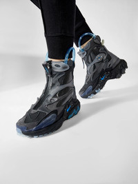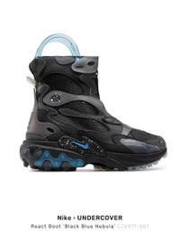 Unisex — Nike React Boot / UC Fall/Winter 2019/20 'Black Blue Nebula' DS. Developed in collaboration with Jun Takahashi’s rebellious fashion label, the Undercover x React Boot 'Brown' delivers a modern interpretation of the classic rubber boot. The layered upper, constructed from mesh, leather and synthetic, features zippered closure and an inflatable airbag around the collar, complete with air-pump technology for a custom fit. The towering silhouette sits on a plush React foam midsole, itself supported by a rugged rubber outsole. • SKU: CJ6971-001 • Size: UK 9.5 / US 10.5 US / EUR 44.5 Men's • Colorway: BLACK / ANTHRACITE-BLUE • Condition: Brand New with OG Box • Retail price: €252 EUR • Release date: 30/11/2019 Ready-to-ship worldwide via premium carriers (DHL Express, FedEx, UPS) within 48 hours after payment cleared. #nike #juntakahashi #undercover #undercoverboots #boots #fw19 #fw20 #runwayshoes #highfashion #techwearshoes #unisex #reversibletechwear #deadstock #runwayshoes #avantgarde #blackandblueaesthetics #deibido #高橋盾