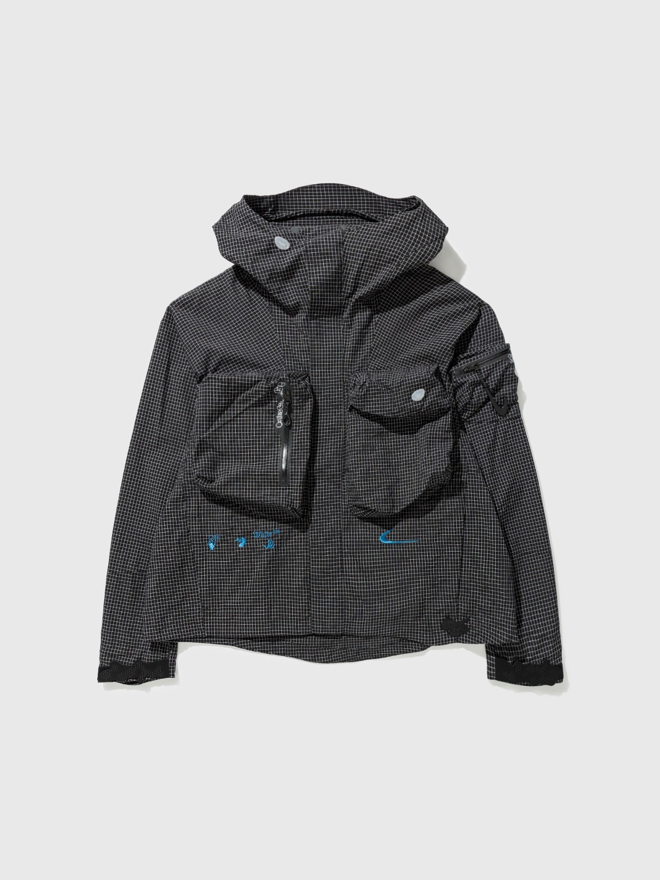 Nylon-blend multi-pocket jacket featuring graphic logo text. Embroidered logo prints and text at front. Drawcord pulls at hem. Velcro and zip closures at front. · Nike x Off-White™ collaborative collection · Lightweight and durable Dyneema ripstop nylon exterior · Full coverage drawcord hood · Seamed seals · Zip closure secured with hook-and-loop fastening · Four front pockets · One sleeve pocket with Swoosh zipper pull · Adjustable cuff and hem · Color: Black · Material: 92% Nylon, 8% Polyethylene · Model is 190cm wearing size L • SKU: DN1749-010 • SIZE: S • CONDITION: Brand new with tag • MSRP: € 579,00 EUR Shipped worldwide via premium carriers (DHL Express, FedEx, UPS) within 48 hours after payment cleared. *Instruction for International Buyers: Estimated Delivery is 7~10 business days with Tracking Number. Import duties, taxes, and charges are not included in the item price. #nike #offwhite #virgilabloh #collabs #sportswear #deibido