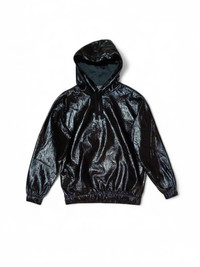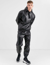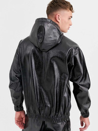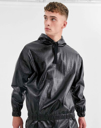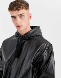 asos Jacket Men's Large Black Shiny Faux Leather Hoodie with drawsting hood, long sleeve, lightweight, over-the-head style, stretch trims, oversized fit. • Size: S • Model's height: 6'2.5" / 1m89 • Model is wearing size Medium • Condition: Like New • Coating: 100% Polyurethane • Base Fabric: 100% Polyester Ready-to-ship worldwide via UPS within 24 hours after payment cleared. #asos #menswear #darkwear #asosdesign #hoodie #blackaesthetics #fallwinter