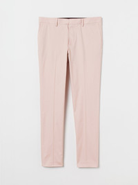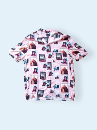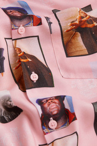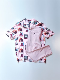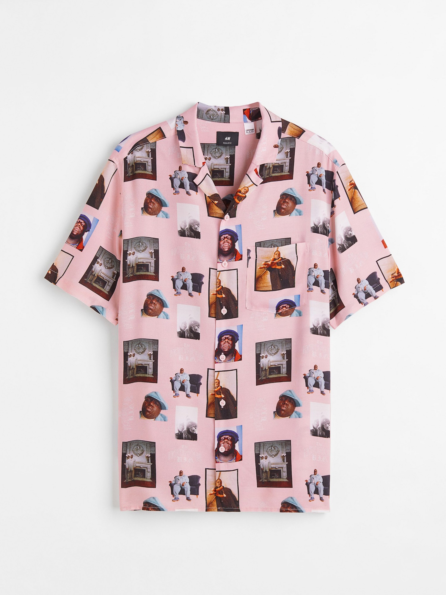 Men's H&M Biggie Smalls light pink button down shirt limited edition. Short-sleeved shirt in softly draping viscose with a fashionable printed pattern. Relaxed fit with a resort collar, french front and a yoke at the back. Open chest pocket and a straight-cut hel with a slit at each side. (retail: €19.99 EUR) + Pastel pink skinny fit suit pants in a woven, stretch cotton blend. Zip fly with concealed hook-an-eye fastener, side pockets. Legs with creases. Regular fit - slightly shorter legs with close-fitting thighs, knees, and ankles for a fully tailored silhouette (retail: €49.99 EUR) Size: L Season: Spring / Summer Condition: Like New, worn once. #hm #notoriousbig #pinkaesthetic #rare #soldout #springsummer #menswear #springsummer24