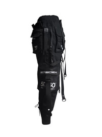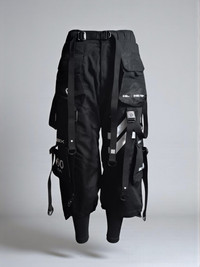 Dual layers Black variant Rugged heavy cargo pants designed by Rajaya Yogaswara aka. MAC/M56. Soldout. No restock expected. [ Product details ] - Flex polyester fibres leggings inside - Adjustable outer Hem with flex strings buckle. - Multiple Pockets and Compartments. - 8 Compartments - 2 Extra L/R buckle webbings. - Removable buckle and webbings. - Sharp cut plastisol prints. - Premium cargo canvas. - Model is 165cm wearing size S. - Made in Indonesia • Size: S • Weight: 1100 g • Condition: Close to unused Shipped worldwide via premium carriers (DHL Express, FedEx, UPS) within 48 hours after payment cleared. *Instruction for International Buyers: Estimated Delivery: About 5~10 days with Tracking Number. Import duties, taxes, and charges are not included in the item price. #machine56 #m56 #kurowear #techwear #reversibletechwear #jfashion2024 #japanesefashion #avantgarde #futurefashion #cargopant #darkwear #blackaesthetics #rare #deibido #madeinindonesia