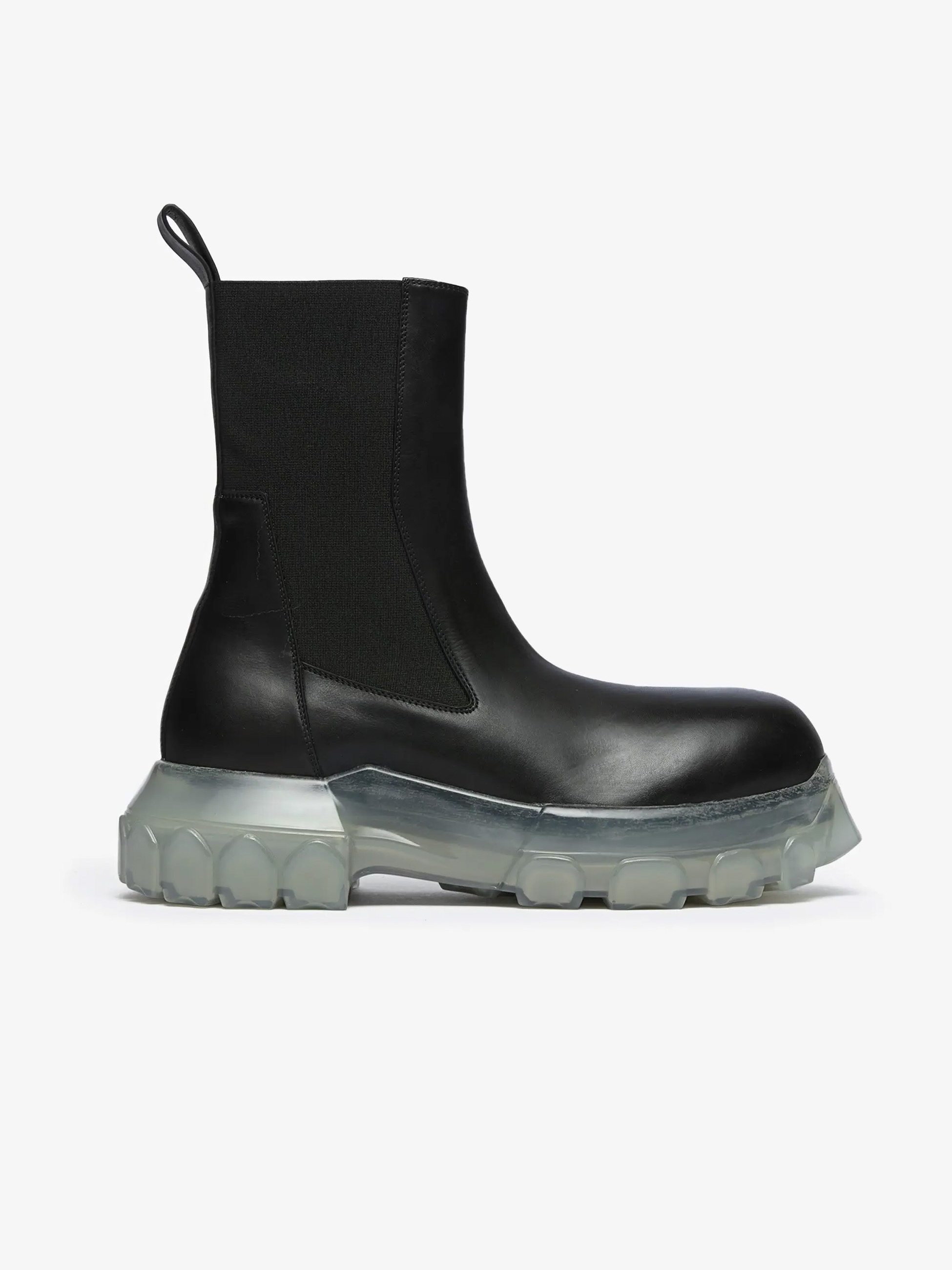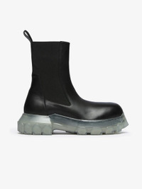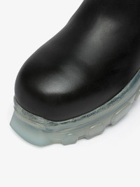 Black Polished Calfskin Strobe Beatle Bozo Tractor Sole Ankle Chelsea Boots - Porterville. · Back pull tab at heel collar · Elasticated side gussets · Polished calfskin lining · Clear PU lugged platform sole · Approximately 45 mm platform · Transparent rubber tractor sole · Supplier color: Black/Clear · Made in Italy ▪ Upper Composition: 100% Calfskin ▪ Sole: Thermoplastic polyurethane ▪ Style ID: RP02D3881LOO0 90 ▪ Size: EU 39.5 ▪ Condition: Excellent ▪ MSRP: € 1.025 EUR Shipped worldwide via premium carriers (DHL Express, FedEx, UPS) within 48 hours after payment cleared. *Instruction for International Buyers: Estimated Delivery: About 5~10 days with Tracking Number. Import duties, taxes, and charges are not included in the item price. #rickowens #boots #avantgarde #darkwear #blackaesthetics #deibido