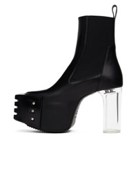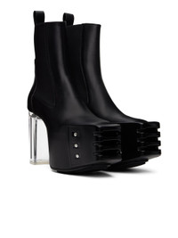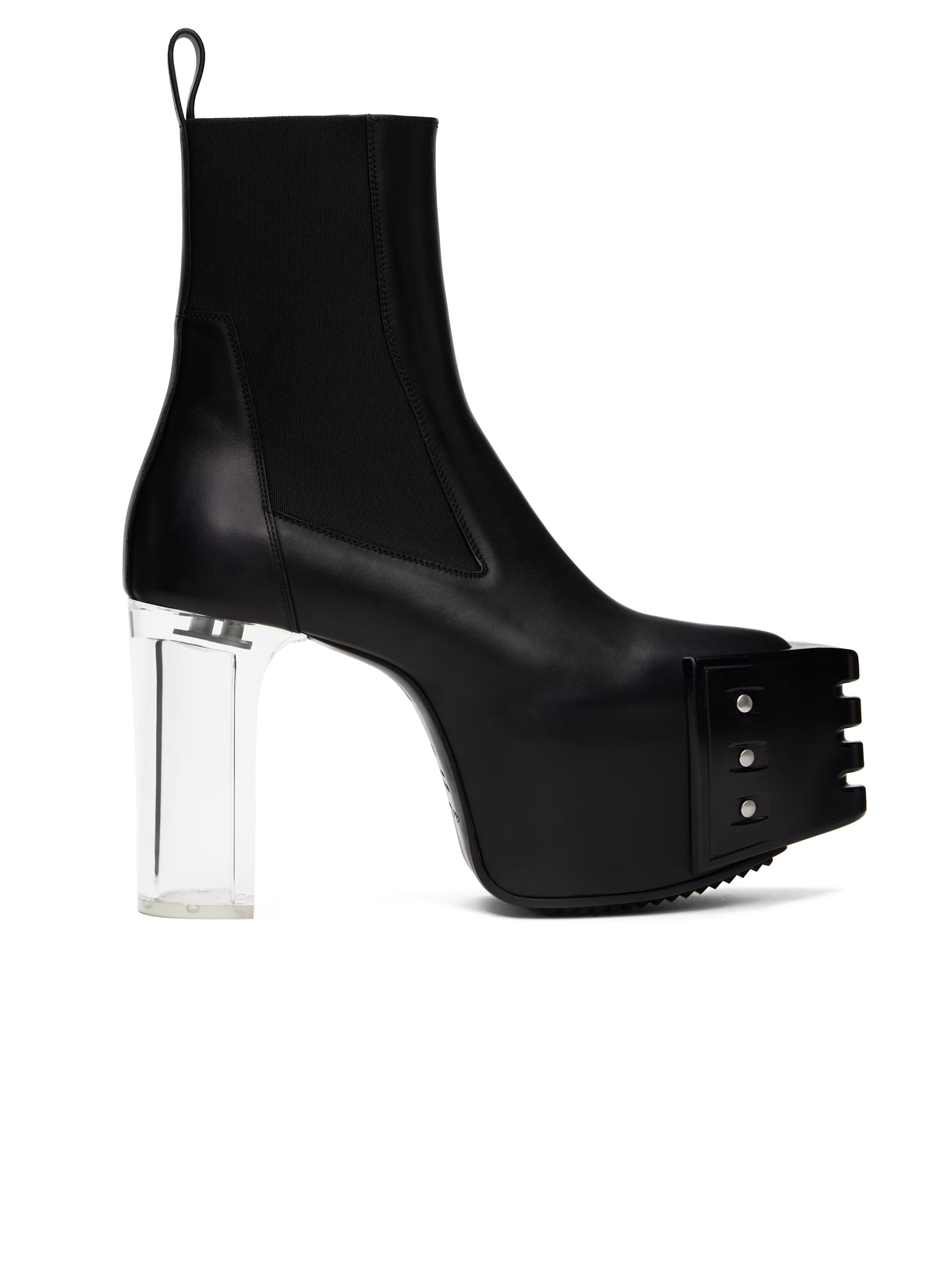 Black Beveled Platform Chelsea boots in washed, vegetable-tanned calfskin. · Square toe studded plate · Pull tab at heel collar · Elasticated side gussets · Polished calfskin lining · Stacked, transparent Plexiglas heel · Covered platform midsole · Approximately 85 mm platform · Approximately 125 mm heel · Upper: Calfskin · Sole: Leather, thermoplastic polyurethane · Leather sole with injection-molded rubber tread · Made in Italy ▪ Style ID: RU02A5825 LGE ▪ Size: IT 41 ▪ Colorway: Black / Clear ▪ Condition: Excellent with OG Box ▪ MSRP: € 1.675 EUR Shipped worldwide via premium carriers (DHL Express, FedEx, UPS) within 48 hours after payment cleared. *Instruction for International Buyers: Estimated Delivery: About 5~10 days with Tracking Number. Import duties, taxes, and charges are not included in the item price. #rickowens #boots #avantgarde #luxury #darkwear #blackaesthetics #deibido #rare #highshoes #leatherboots