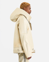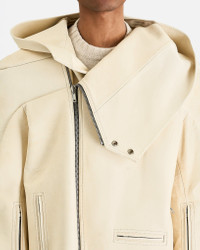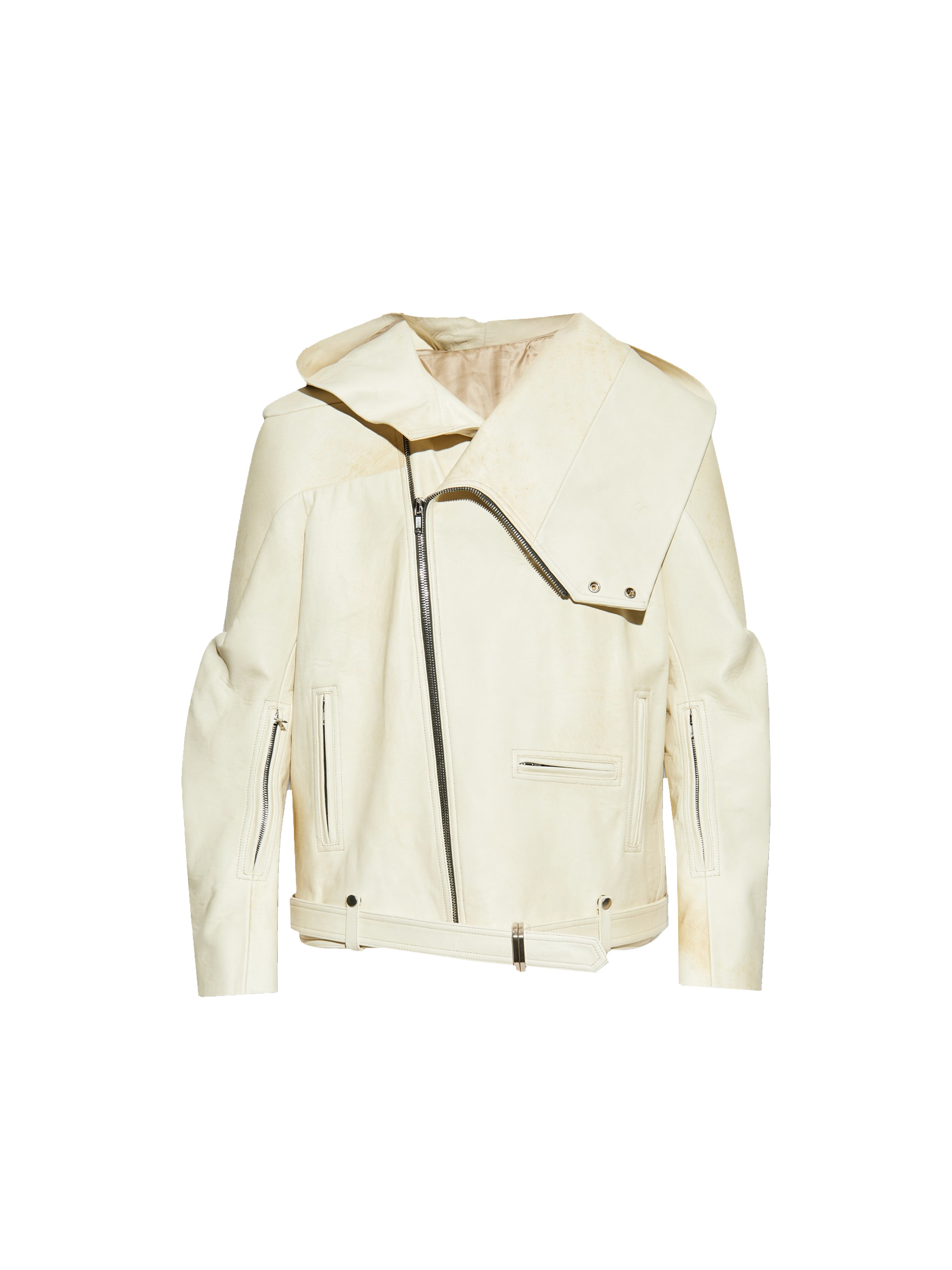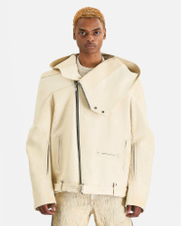 Introducing the "Stooges" Leather Jacket, a creation by one of the most avant-garde designers of our time – Rick Owens. Made from the highest quality lambskin leather, the jacket captivates with its unique light gold hue, exuding elegance and sophistication. The unique asymmetrical zipper highlights the modern design, while the oversized collar serves both decorative and protective purposes. The lower part of the jacket features a belt with a metal buckle, allowing for a perfect fit. Zip-fastened pockets provide practicality, and zippers on the cuffs allow for width adjustment. · Snap button guard at neck · Asymmetrical front zip closure · Girded level shoulder seams · Padded shoulders · Utility zip pockets at sleeves · Interior zip pockets · Belt loops with snap button detail · Detachable belt at waist with d-rings · Fully lined · Lining: 100% cotton · Main: 100% lambskin · Model is 6'1" · Made in Italy • SKU: RR01E5704-LBH-81 • SIZE: OS • SUPPLIER COLOR: PARCHMENT • CONDITION: BRAND NEW W/ TAG • RRP: $ 7.740 Shipped worldwide via UPS within 48 hours after payment cleared. *Instruction for International Buyers: Estimated Delivery: About 7~10 days with Tracking Number. Import duties, taxes, and charges are included in the item price. #rickowens #hollywood #avantgarde #consignment #runwaypiece #leather #lambskin #minimalfashion #beigeaesthetics #highfashion #luxury