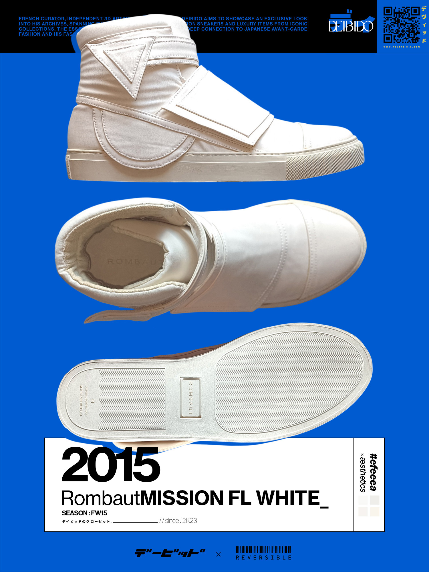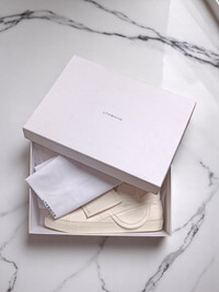 Mats is the head of ROMBAUT, an eco-friendly Belgian fashion brand. After collaborating with Cédric Jacquemin, Damir Doma, and Lanvin, he launched his own brand based on a strong aesthetic and human values. A vegan himself, he refuses to use materials of animal origin. He is constantly seeking natural but high-quality materials such as polyurethane (to replace leather, as with Stella McCartney) for unisex streetwear collections. He uses latex-coated cotton or fabrics made from African motouba fig bark, which is latex-coated, making it waterproof and durable. While it's possible to have reservations about the eco-friendly properties of plastic, polyurethane is the least polluting on the market and also antibacterial, preventing the sneaker effect. While the idea of wearing plastic may leave many skeptical, the ROMBAUT approach is one of innovation and research. The brand shows that solutions exist for a fair future while feeling good about itself. Mats Rombaut's creations encourage us to modernize our way of thinking. For the ROMBAUT Fall/Winter 2015 collection, fencing was the main and symbolic influence. The elegance and discipline of the sport perfectly reflect ROMBAUT's principles of technical excellence, determinism, and moral improvement. The colors and materials are closely inspired by and linked to fencing: white, black, silver, and royal blue are all featured in the collection. The sustainably sourced materials nonetheless remain luxurious, while still following ROMBAUT's demanding ecological ethos—with technical fabrics and synthetic leathers, both integral parts of the collection. To highlight the symbolism and fighting spirit of the brand, the international fencing champion, Race Imboden was the ambassador of the collection in the Automne/Hiver 2015 campaign. • Creative Director: Mats Rombaut • Condition: 9.5/10 • Size: US 10 / EUR 44 • Supplier color: Beige • Season: Automne / Hiver 2015 • Made in Portugal Ready-to-ship worldwide via premium carriers (DHL Express, FedEx, UPS) within 24 hours after payment cleared. *Instruction for International Buyers: Estimated Delivery: About 5~10 days with Tracking Number. Import duties, taxes, and charges are not included in the item price. These charges are the buyer's responsibility. Please check out your country's customs office to determine what these additional costs will be prior to bidding or buying. #rombaut #matsrombaut #aw15 #archive #vintage #luxury #ecofriendly #ecoleather #sustainable #futuristic #reversibleexclusive #hightop #sneakers #minimalfashion #beigeaesthetics #limitededition #deibido #rare #madeinportugal