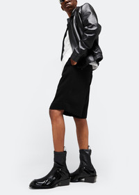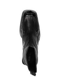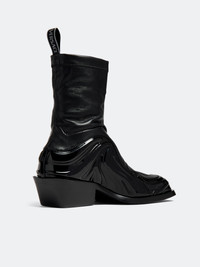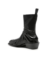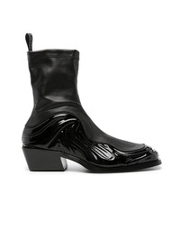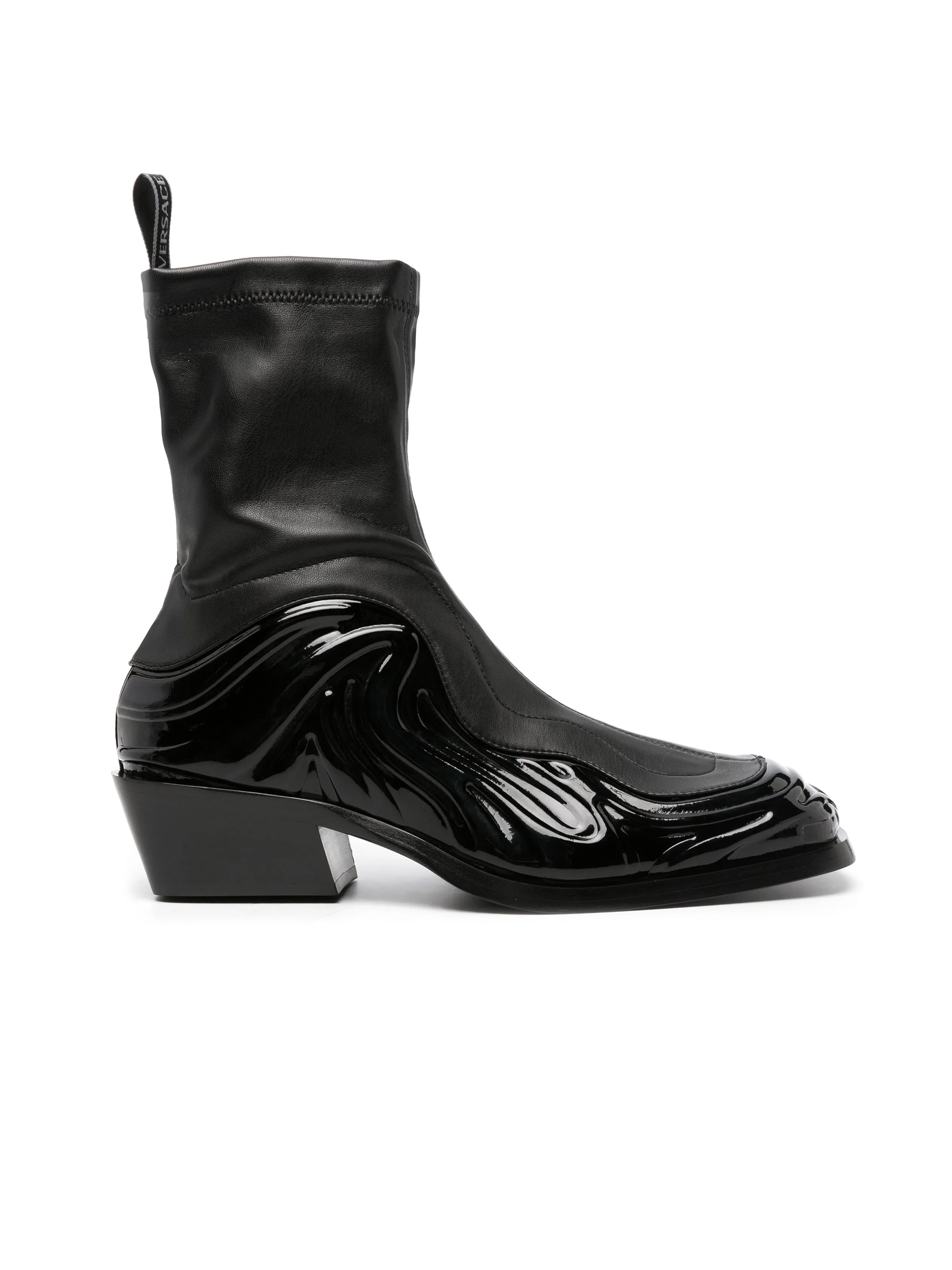'Solare' ankle-high grained and patent faux-leather boots in black with a sock-like feel, leather look, and glossy mudguard in a wavy design. VERSACE's Solare boots deliver on both comfort and style. They feature a slanted stacked block heel, logo pull tab and calf leather lining. Fits true to size, take your normal size. · SKU: 1011425-1A08712-1B000 · Black Fabric · Square toe · Pull-loop at sock-style collar · Jersey and buffed calfskin lining · Stacked calfskin heel with rubber injection · Calfskin outsole with rubber injection · Heel: H2 in · Made in Italy • Size: IT 44 • Condition: Brand new with OG Box • MSRP: €969,00 EUR Shipped worldwide via premium carriers (DHL Express, FedEx, UPS) within 48 hours after payment cleared. *Instruction for International Buyers: Estimated Delivery is about 5~10 days with Tracking Number. Delivery times may vary based on the destination. Import duties, taxes, and charges are not included in the item price. #versace #boots #avantgarde #conceptart #luxury #highshoes #darkwear #blackaesthetics #rare #madeinitaly #deibido