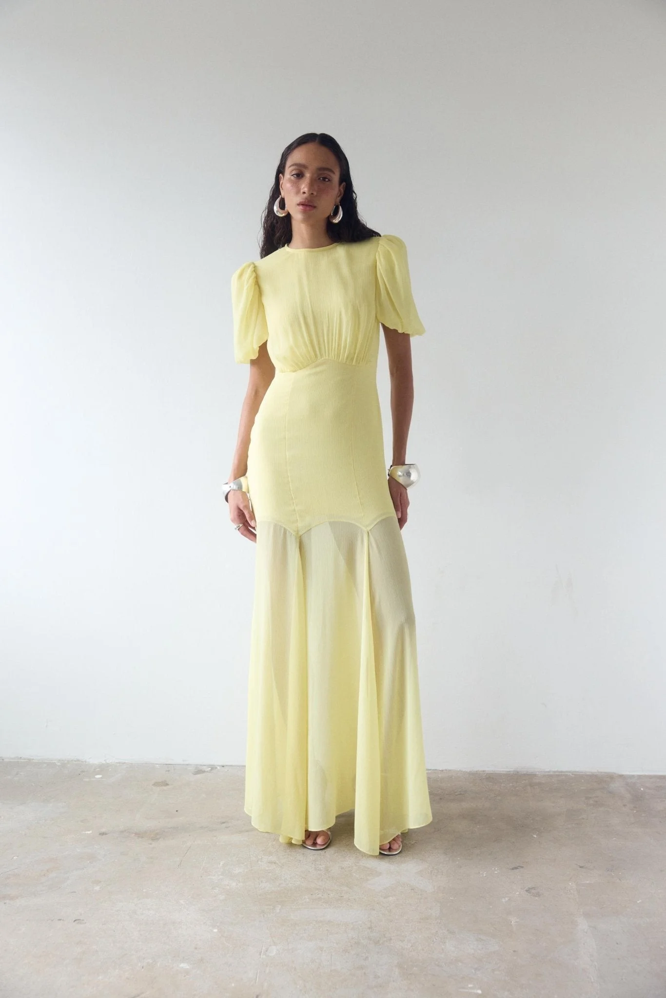 Maxi length dress Skirt is semi-sheer High round neck with puff sleeves Main body is lined for modesty Suitable for wearing a bra Fitted bodice with princess seam detail Concealed zip at centre back PRODUCT DETAILS & FIT Designed to skim the body Dress is accessed through concealed zip at centre back This style is bra friendly Fits true to size Dress length: 154cm (UK8) 100% polyester Dry clean only This style can be altered in length and fit Designed in Ibiza & London Model is 5’10 / 178cm wearing a UK8 / US 4 / EU 36
