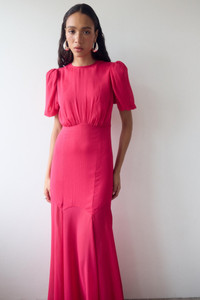 Maxi length dress Skirt is semi-sheer High round neck with puff sleeves Main body is lined for modesty Suitable for wearing a bra Fitted bodice with princess seam detail Concealed zip at centre back PRODUCT DETAILS & FIT Designed to skim the body Dress is accessed through concealed zip at centre back This style is bra friendly Fits true to size Dress length: 154cm (UK8) 100% polyester Dry clean only This style can be altered in length and fit Designed in Ibiza & London Model is 5’10 / 178cm wearing a UK8 / US 4 / EU 36