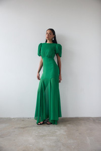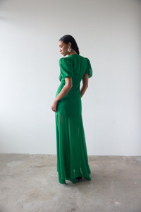 The Agua Maxi Dress in palm green crinkle chiffon showcases a true signature De La Vali gown. This lightweight crinkle chiffon garment boasts a semi-fitted bodice with bust ruching, a fluid fishtail skirt in panels of semi sheer luxe fabric, and voluminous puff sleeves accented with internal organza ruffles to create a dramatic, feminine silhouette. PRODUCT DETAILS & FIT - Full length maxi dress with short shoulder puffed sleeves - Skirt is unlined & semi sheer - High round neck - Main body is lined for modesty - Suitable for wearing a bra - Scalloped detail where main body meets skirt - Concealed zip at centre back This style is crafted from a lightweight crinkle chiffon selected for its delicate drape and flow. This style is selected for its romantic and airy feel. No wonder it is one of our founder's favourite pieces. Fits true to size, select your normal size. Model is 5’10 / 178cm wearing a UK8 / US 4 / EU 36 CARE Dry clean only Designed in Ibiza & London