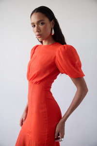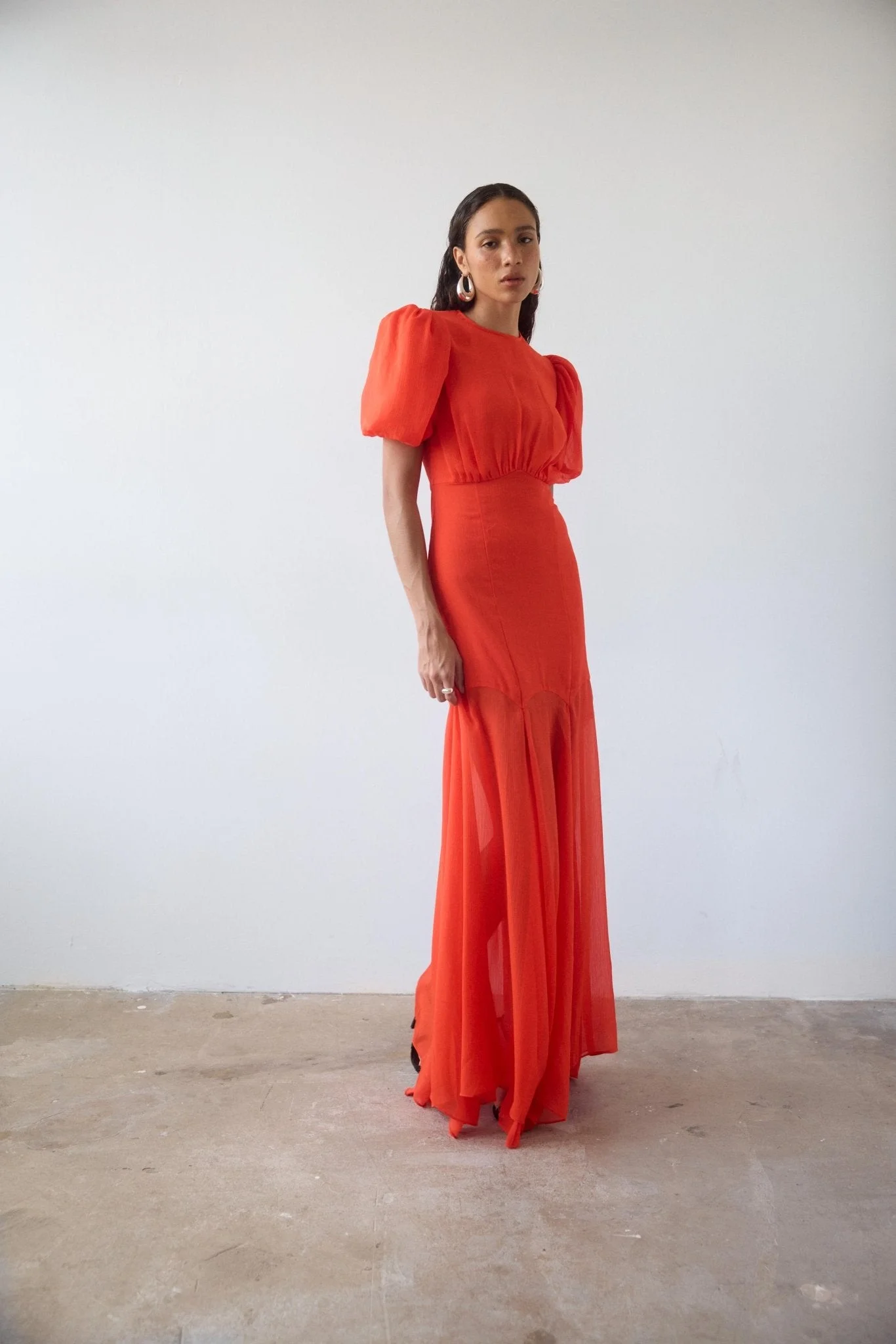 The Agua Maxi Dress in vibrant tomato red crinkle chiffon showcases a true signature De La Vali gown. This lightweight crinkle chiffon garment boasts a semi-fitted bodice with bust ruching, a fluid fishtail skirt in panels of semi sheer luxe fabric, and voluminous puff sleeves accented with internal organza ruffles to create a dramatic, feminine silhouette. PRODUCT DETAILS & FIT - Full length maxi dress with short shoulder puffed sleeves - Skirt is unlined & semi sheer - High round neck - Main body is lined for modesty - Suitable for wearing a bra - Scalloped detail where main body meets skirt - Concealed zip at centre back This style is crafted from a lightweight crinkle chiffon selected for its delicate drape and flow. This style is selected for its romantic and airy feel. No wonder it is one of our founder's favourite pieces. Fits true to size, select your normal size. Model is 5’10 / 178cm wearing a UK8 / US 4 / EU 36 CARE Dry clean only Designed in Ibiza & London