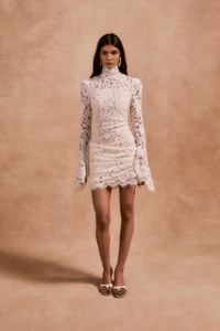 Long sleeve lace mini dress with high neckline - Mini length - Fitted flare long sleeve - Draped waist detail with rose applique - Nude mini slip dress - High scallop edge neckline This style is crafted from a delicate white lace in a elegant ivory. The Bodita is selected for its elegant lace detailing, perfect for a bridal occasion. PRODUCT DETAIL & FIT - Concealed zip at centre back - Fits true to size - Dress length: 84cm (UK8) - 70% cotton 30% polyester - Dry clean only Model is 175cm / 5” 9” wearing a UK6 / US 2 / EU 34 Designed in London & Ibiza