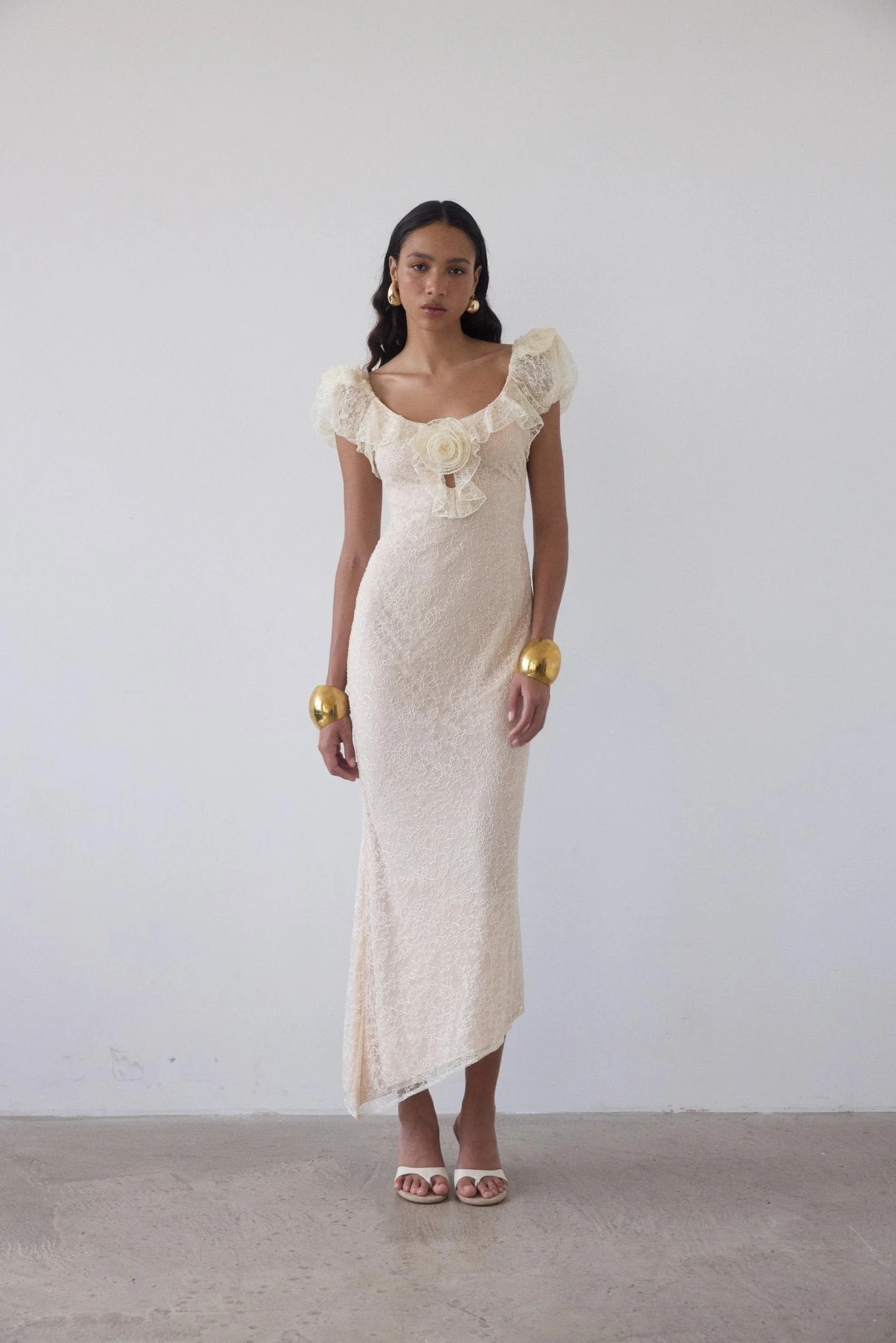 Short blouson sleeve Ruffle bust detail Rose applique at bust Asymmetric hem Side zip detail PRODUCT & FIT Fits true to size Dress Length: 127cm (UK8) 75% Nylon, 25% Viscose Dry Clean Only Designed in London & Ibiza Model is 5’10 / 178cm wearing a UK8 / US 4 / EU 36