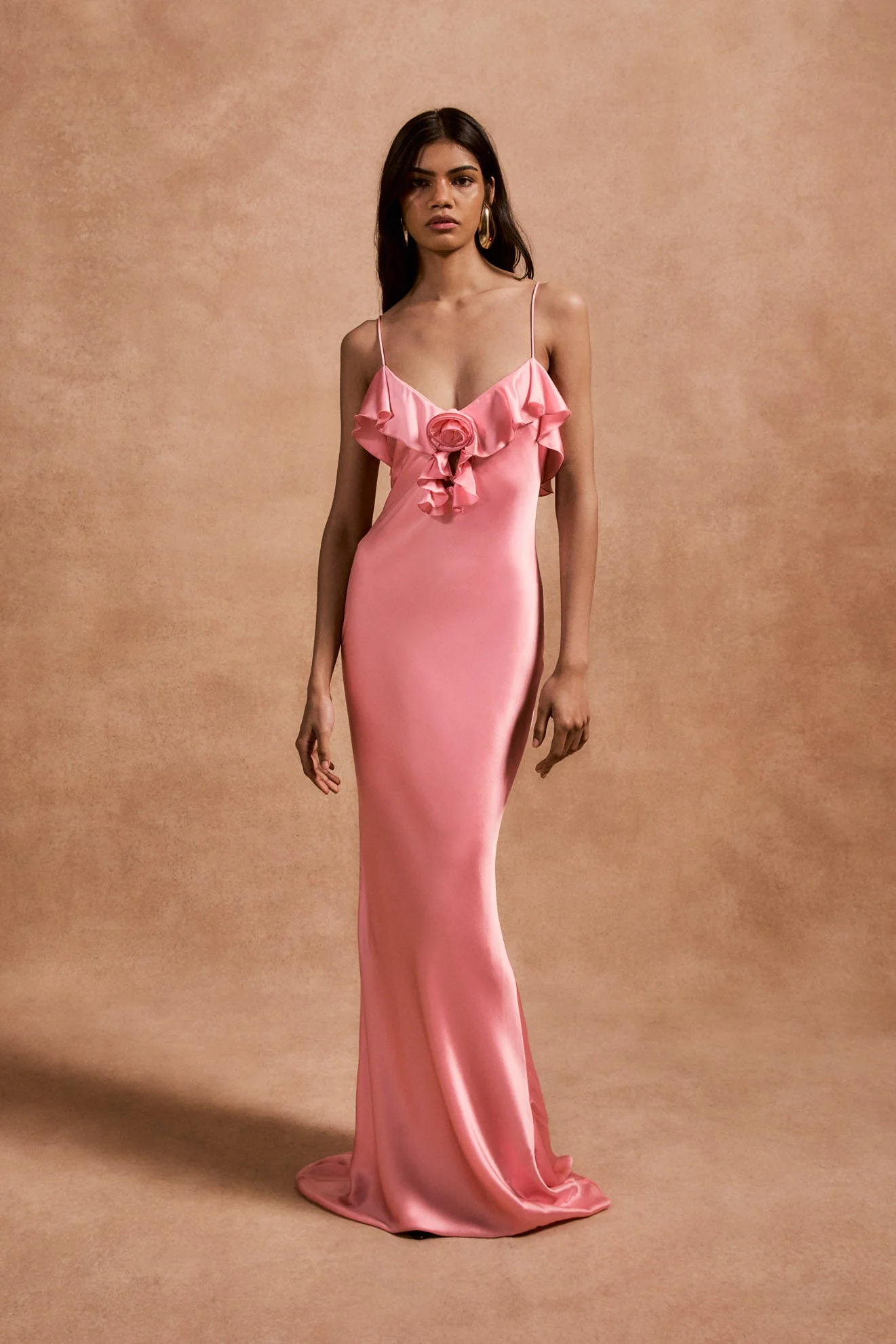 Silk Satin Maxi Dress with ruffled bust and slinky bias cut skirt - Floor length, maxi dress - Ruffled cut out bust detail with rose applique - Bias cut skirt - Skinny straps - Cape sold separately This style is crafted from a luxurious silk satin enriched in a ballet pink. The Esperanza is selected for it's dream-like feel and feminine silhouette. PRODUCT & FIT - Dress length: 152cm (UK8) - This has been designed to be extra long for our customer to alter to desired length - Fits true to size - size up for a relaxed fit. - 52% Silk 40 % Rayon 8 % Spandex - Dry clean only Model is 175cm / 5” 9” wearing a UK6 / US 2 / EU 34 Designed in London & Ibiza