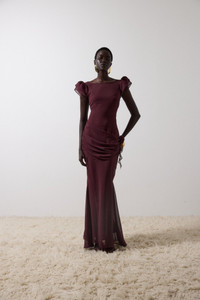 Floor length maxi dress Fishtail hem with godet at side seam Draped waist with rose applique Organza ruffle sleeve Detachable maxi slip dress PRODUCT & FIT Fits true to size Dress Length: 152cm (UK8) 100% Polyester Dry Clean Only Designed in London & Ibiza Model is 5’9.5/177cm wearing a UK8 / US 4 / EU 36