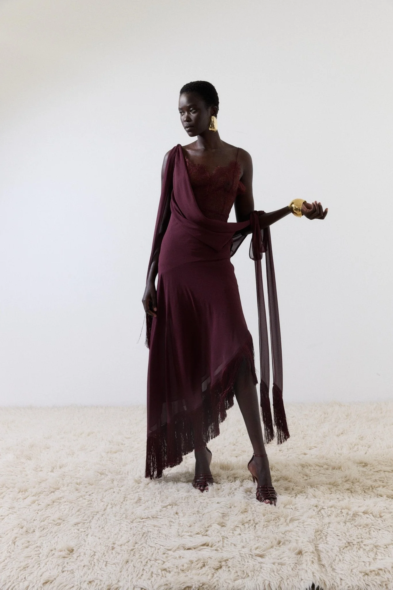 Asymmetric midi dress Detachable fringe hem scarf Tie shoulder detail with fringe hem Draped cowl neck Asymmetric loose fitting skirt with fringe hem Chiffon dress lined in self fabric Detachable lace dress mini slip PRODUCT & FIT Fits true to size Dress Length: 111cm (UK8) OUTER- 100% Polyester LACE SLIP- 75% Nylon 25% Viscose Dry Clean Only Designed in London & Ibiza Model is 5’10 / 178cm wearing a UK8 / US 4 / EU 36