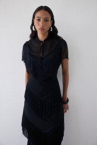 Fringe tier midi dress Mandarin collar with rouleau loop tie fastening at front neck Front neck keyhole Slim fitted bodice Lined from bust edge to the hem - neckline unlined Concealed side zip PRODUCT & FIT Size up for a more relaxed fit Dress Length: 123cm (UK8) 100% Polyester Dry Clean Only Designed in London & Ibiza Model is 5’10 / 178cm wearing a UK8 / US 4 / EU 36
