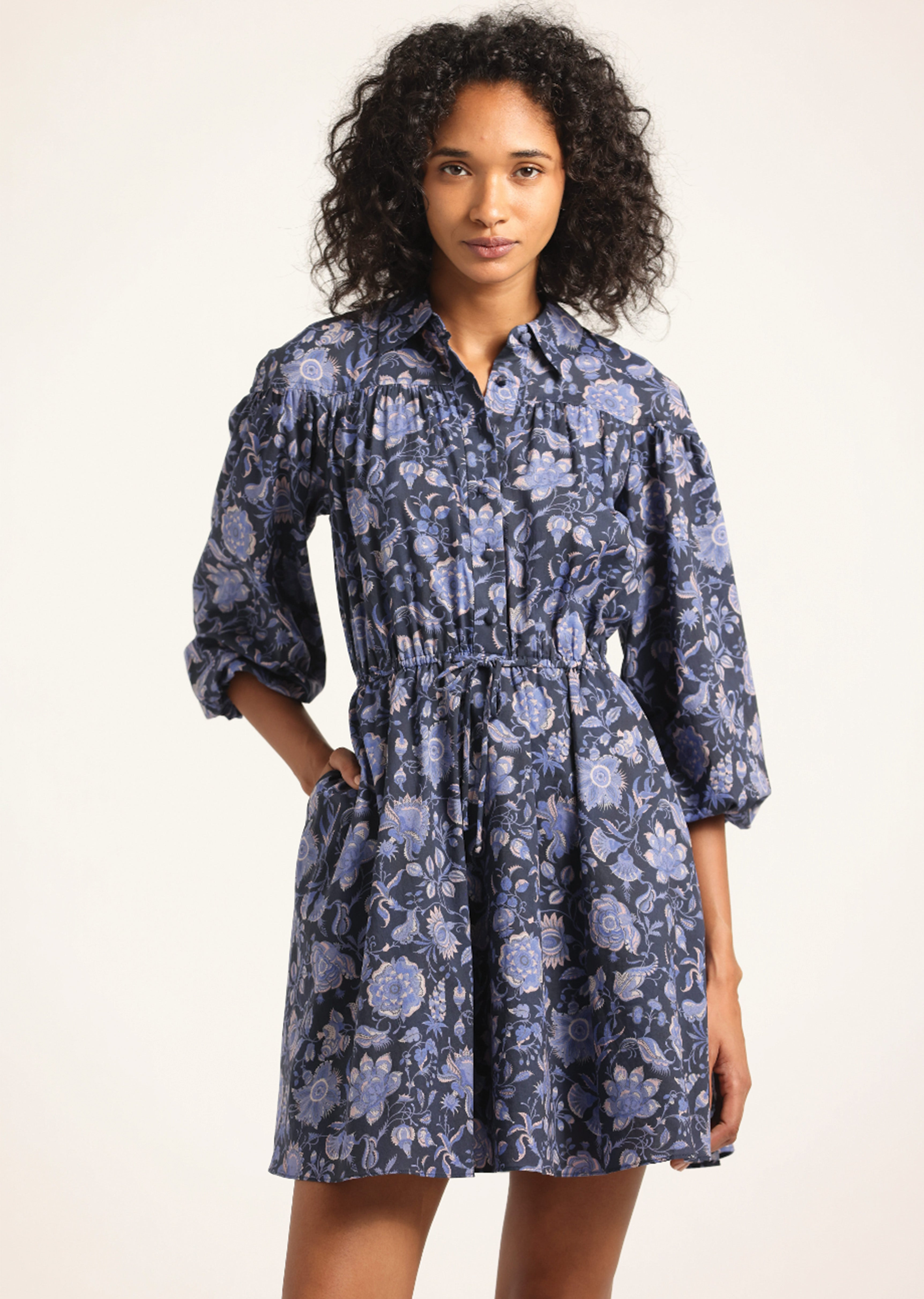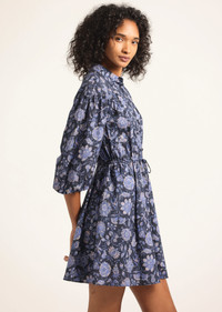 The Arbi Shirt Dress is crafted from a crisp cotton poplin. The A-line silhouette is designed with a classic collar, forward yoke seam, and covered buttons along the placket. It is cinched in at the waist with elastic shirring and falls softly into a voluminous skirt that hits above the knees. It's finished with waist ties with pearl cord ends. This easy, lightweight mini dress is perfect for spring and summer. SKU: TCOP5219AVOP - 98% Cotton, 2% Spandex - Imported SIZE & FIT Model is 5'10 wearing a size 2. This style runs true to size. FEATURES & DETAILS - Dry clean only