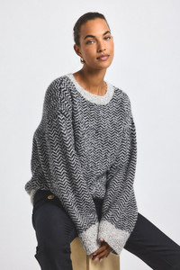 Make Astrid the newest addition to your knitwear collection. Undeniably soft and extra cozy, the sweater is crafted in a herringbone jacquard print. It’s made for an oversized silhouette, with exaggerated, wide sleeves. Features rib trim on the collar, hem and cuffs. SKU: TF529398YMB - 45% Nylon, 28% Alpaca, 27% Wool - Imported SIZE & FIT Length from shoulder to hem is 22.5” | Sleeve Length is 30.75",based on a size S. Our model is 5’9” and is wearing a size S. This style runs true to size. FEATURES & DETAILS - Dry clean only