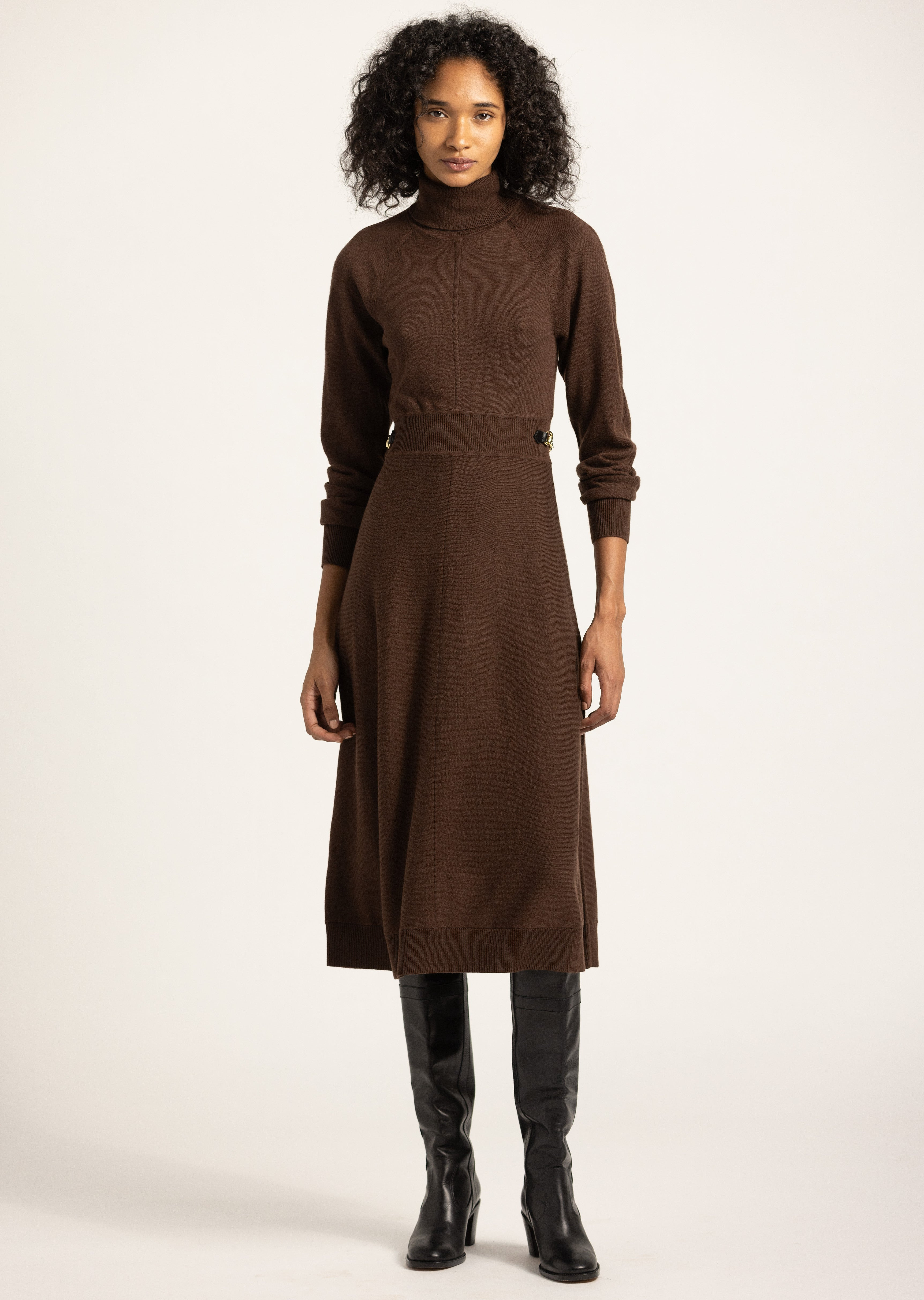 The Becky Raglan Horsebit Sweater Dress is crafted from a compact merino wool knit. The feminine fit-and-flare silhouette is accentuated by a ribbed waist panel finished with a gold horse-bit hardware and black leather tabs. It features a turtleneck, drop shoulders, long sleeves and a fluid shape that falls below the knee. SKU: TCOP9073YMD - 100% Wool - Imported SIZE & FIT Model is 5'10 wearing a size S. This style runs true to size. FEATURES & DETAILS - Dry clean only