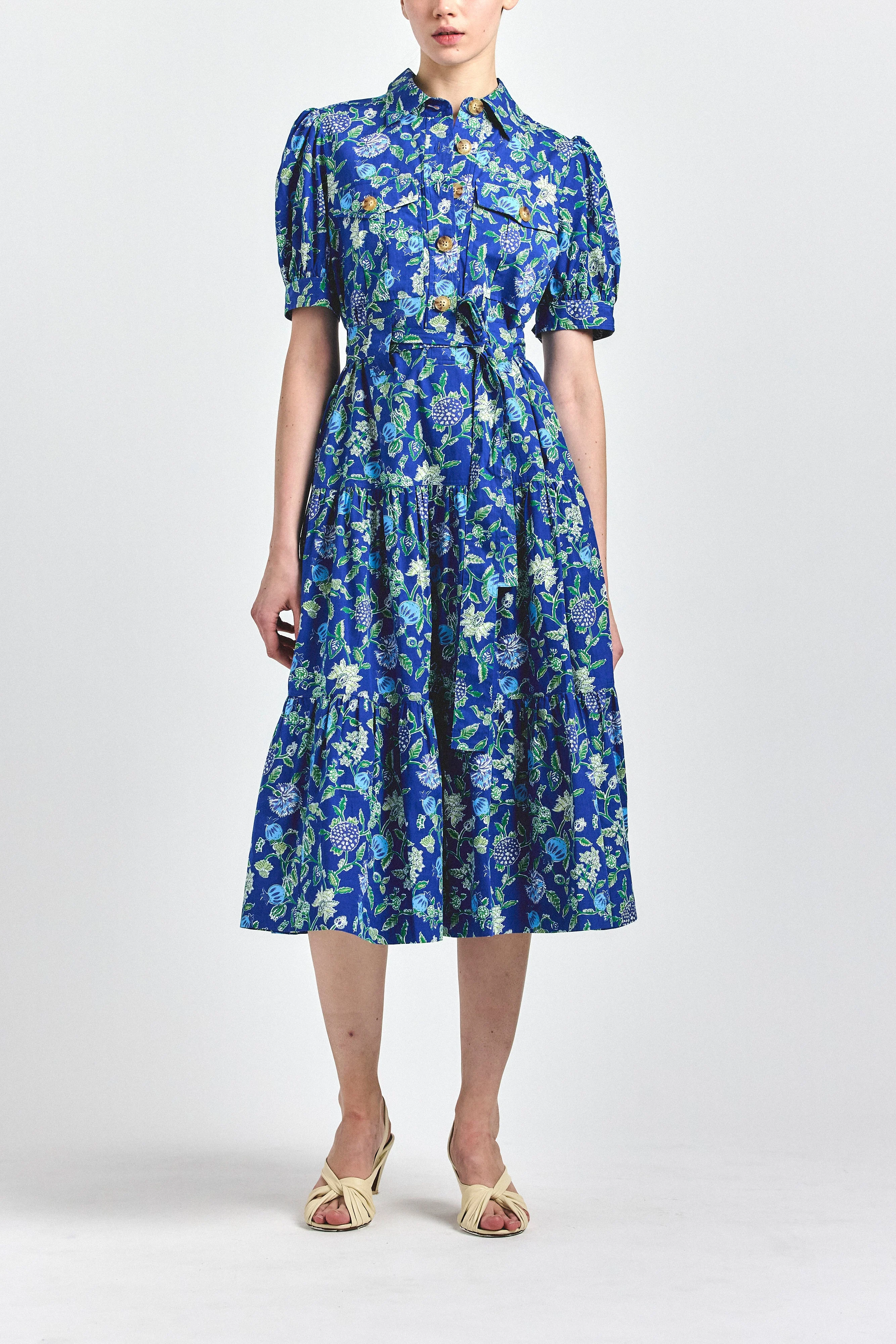 This dress brings structure and softness together in perfect balance. Designed with a crisp collared neckline, puff sleeves, and a button front silhouette, it features a self-tie belt that defines the waist and a tiered silhouette with movement. Rendered in a rich blue floral, it’s a polished day to evening piece with timeless appeal. SKU: TCOP5157CPP - Machine Wash - 100% Cotton - Imported SIZE & FIT Length from shoulder to hem 47" |Shoulder 14" |Waist 39" |Bust 39" | Hips 44", based on a size S. This style runs true to size. FEATURES & DETAILS - Full button front closure - Short puff sleeves with cuff and button detail - Chest flap pockets with decorative buttons - Self tie belt - Tiered midi silhouette - Allover floral print