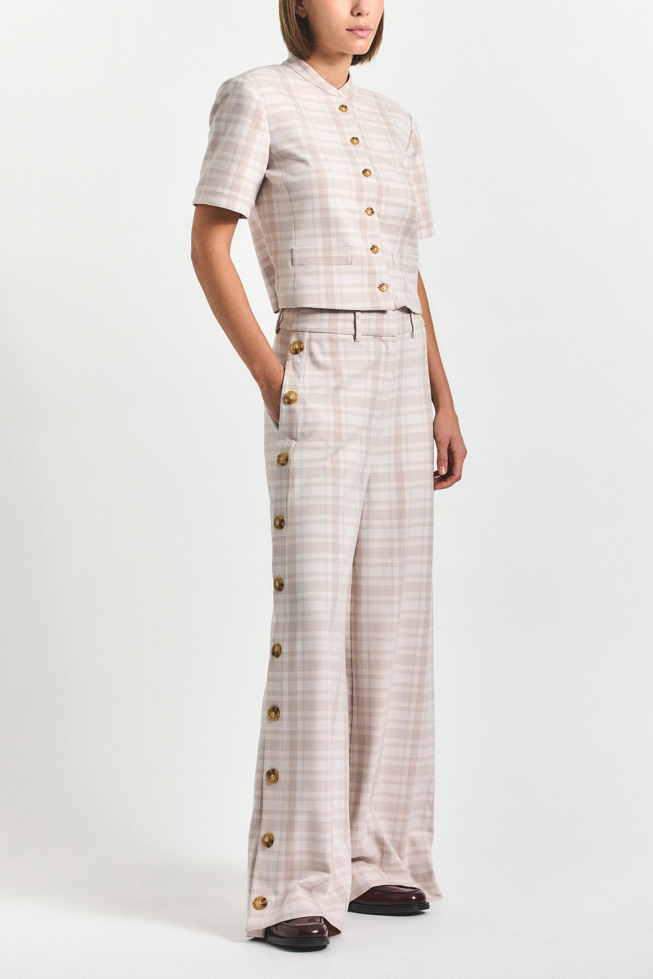 A study in modern tailoring. This wide-leg pant is cut from a softly textured plaid fabric and finished with polished button detailing along the side seam. Designed with a relaxed drape and elongated silhouette, it brings effortless refinement to everyday dressing, equally elevated with a matching vest or styled back to a crisp knit. SKU: TCOP1220PST - Imported FEATURES & DETAILS - Dry Clean Only