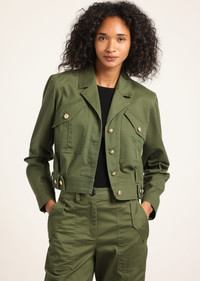 The Celinora Cropped Jacket in fatigue green is crafted from a uniquely soft stone-washed stretch cotton twill. It is tailored with a relaxed fit and cropped silhouette. It features two front utility cargo pockets and a front closure with gold crest buttons. SKU: TF512209COT - 61% Cotton, 37% Polyester, 2% Spandex - Imported SIZE & FIT Sleeve length is 32" based on a size S. Our model is 5’9” and is wearing a size S. This style runs true to size. FEATURES & DETAILS - Dry clean only