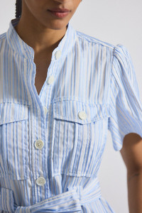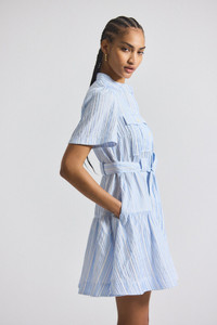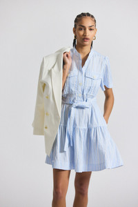 The Clynton Short Sleeve Dress is a stylish and refined shirt dress for the everyday. Crafted from a soft, stretch pintuck stripe fabric, this mini dress features a tiered skirt for added volume, and a self-tie belt that cinches the waist, giving it a feminine silhouette. Finished with a front placket to the waist and functional front pockets for a utility twist. SKU: TP525531PSV - 95% Polyester, 5% Elastine - Imported SIZE & FIT Length from shoulder to hem is 36” | Sleeve Length is 17.5",based on a size 2. Our model is 5’10” and is wearing a size 2. This style runs true to size. FEATURES & DETAILS - Dry clean only