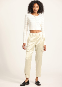 The Elian is a modern take on a Derek Lam 10 Crosby signature silhouette. These utility trousers are meticulously tailored with a cropped, slim and tapered leg, and are intended to sit mid-rise. With patch pockets on the back, utility pockets on the front, and flap pockets on the leg, the pants lean into a structured, functional aesthetic. Crafted in a light-weight satin twill. Model is one size up from her normal size for a more relaxed fit. SKU: TF51108SPN - 98% Polyester, 2% Spandex - Imported SIZE & FIT Front Rise 11”, Back Rise 16.25" | Inseam 27.5” | Leg Opening Circumference 12”, based on a size 4. Our model is 5’9” and is wearing a size 4. This style runs true to size. FEATURES & DETAILS - Dry clean only