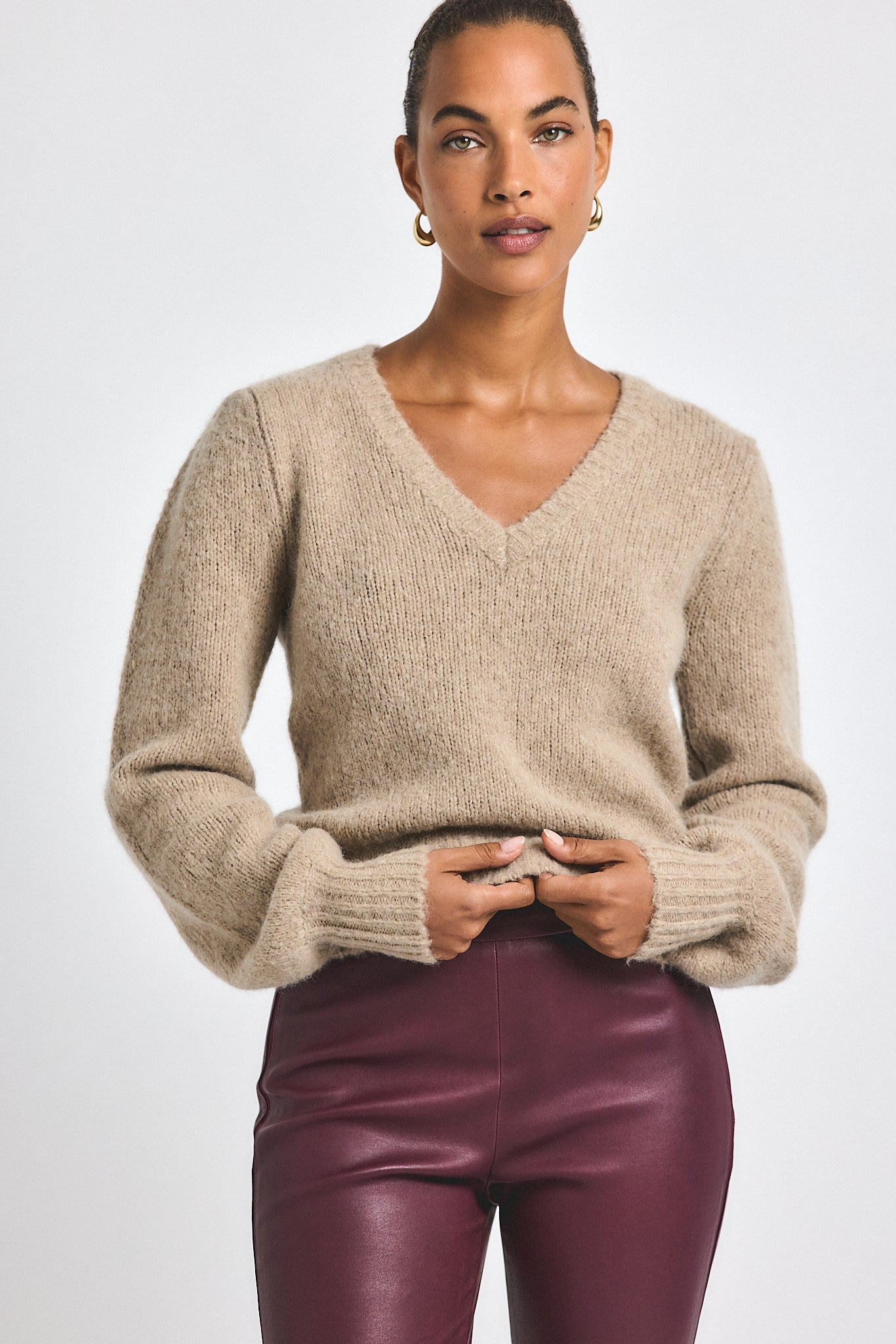 Knit from a soft, plush yarn, the Evander Sweater is an elevated classic you can layer through the seasons. This versatile V-neck style has an easy, relaxed fit. Finished with extended sleeves and pleating on the shoulders, and rib trim on the cuff and hem. SKU: TF529414YBE - 50% Wool, 30% Nylon, 20% Alpaca - Imported SIZE & FIT Length from shoulder to hem is 20.75". Sleeve Length is 25.5", based on a size S. Our model is 5’9” and is wearing a size S. This style runs true to size. FEATURES & DETAILS - Dry clean only