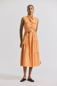 The Florence Sleeveless Shirt Dress is a variation of our classic utility styles with fresh details. It features an adjustable self-belt for a more pronounced waist shape and functional front pockets. Crafted from a featherweight cotton poplin fabrication with a long-tired, A-line silhouette. SKU: TP515428LSM - 70% Viscose, 30% Linen - Imported SIZE & FIT Length from shoulder to hem is 47”, based on a size 2. Our model is 5’10” and is wearing a size 2. This style runs true to size. FEATURES & DETAILS - Dry clean only