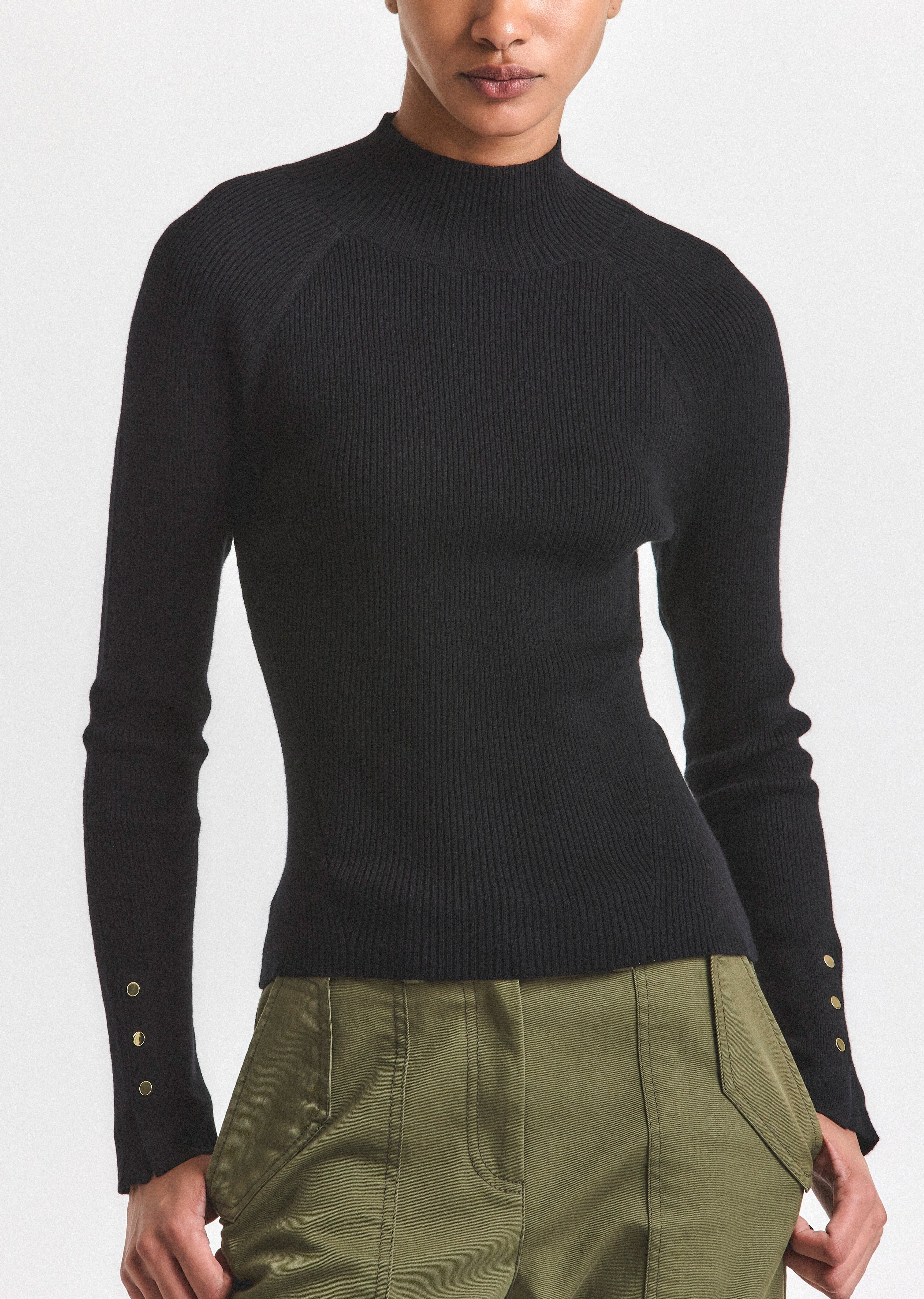 The Kassandra Ribbed Mock Neck Sweater is a compact merino wool style with a mock neck. It features faux gold buttons on the sleeves and a form-fitting silhouette. SKU: TCOP9178CWR - 41% Cotton, 40% Nylon, 16% Wool, 3% Spandex - Imported FEATURES & DETAILS - Dry clean only