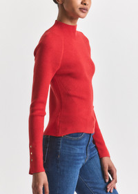The Kassandra Ribbed Mock Neck Sweater is a compact merino wool style with a mock neck. It features faux gold buttons on the sleeves and a form-fitting silhouette. SKU: TCOP9178CWR - 41% Cotton, 40% Nylon, 16% Wool, 3% Spandex - Imported FEATURES & DETAILS - Dry clean only