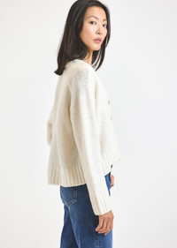 The Lailah Oversized Cardigan is crafted from a soft wool blend. It features a deep V-neckline with front placket and custom pearlized gold rim buttons. The relaxed and cozy cardigan is finished with ribbed detailing along the hem and sleeve cuffs. SKU: TCOP3910WBP - Imported
