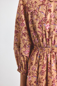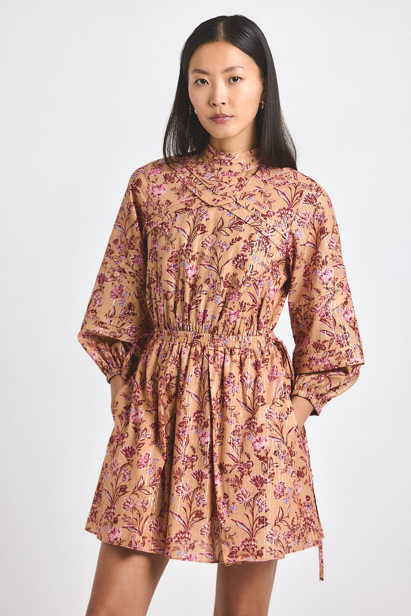 The Marisol Mini Dress is an A-line silhouette, made from a lurex striped cotton voile in a floral print. Flanges detail the mock neckline and front of the dress. The sleeves fall to a three-quarter length, with flanges and an elastic cuff. The dress is designed to gather with an elastic waistband, deep pleats, and ties at the side. Finished with a keyhole back closure, and partially lined for extra comfort. SKU: TF515584LUV - Imported SIZE & FIT Length from shoulder to hem is 37.25” | Sleeve Length is 28",based on a size 2. Our model is 5’10” and is wearing a size 2. This style runs true to size. FEATURES & DETAILS - Dry clean only