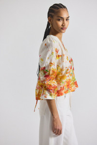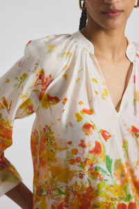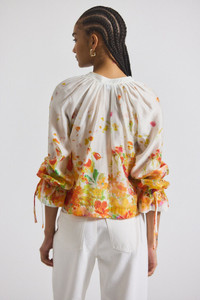 Soft and light-weight, the Milon Organza V-neck Blouse features a collar stand and pleats at the neckline, draping over the shoulders for a flattering, loose-fitted look. Crafted in a degrade floral print, the cropped and slight A-line silhouette of the blouse gives ease and movement. The adjustable sleeves can be cinched in place with a tie or worn open, offering a versatile shape. Pair back with a pair of wide leg jeans, or our Alexia skirt to complete the set. SKU: TP517432LSO - 80% Tencel, 20% Nylon - Imported SIZE & FIT Length from shoulder to hem is 22". Sleeve Length is 32.25", based on a size S. Our model is 5’10” and is wearing a size S. This style runs true to size. FEATURES & DETAILS - Dry clean only