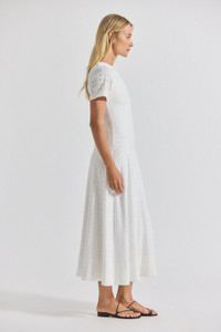 The Olympia Maxi Dress is crafted from soft knit eyelet and is fully lined for a sleek, smooth fit. Elasticated tunnels run down the center front, creating a gathering effect that gently cinches the mid-waist. The dress features t-shirt sleeves and a crew neckline for a sporty edge, while the tie keyhole back opening, finished with binding, and the flowy A-line silhouette add a feminine touch. SKU: TP515522CUE - 95% Polyester, 5% Spandex - Imported SIZE & FIT Length from shoulder to hem is 51.5”, Sleeve Length is 14.5", based on a size 2. Our model is 5’11” and is wearing a size 2. This style runs true to size. FEATURES & DETAILS - Dry clean only