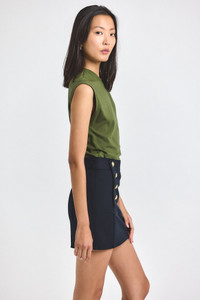 The Reyna Mini Skirt is made from our signature bi-stretch Crosby Twill. The A-line silhouette is fitted and gently tailored, with a side seam zip and gold sailor button details along the hips. SKU: TF514132CR - 96% Cotton, 4% Elastane - Imported SIZE & FIT Waist: 29", based on a size 2. Our model is 5’10” and is wearing a size 2. This style runs true to size. FEATURES & DETAILS - Cover metal embellishments with foil before dry cleaning.