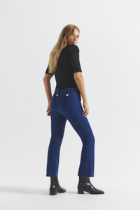 Our iconic cropped trouser with gold sailor button details along the hips is updated this season in a premium comfort stretch Italian denim with a stone-wash finish. Zip fly with button closure, flat front, tonal buttoned belt loops and stitching. SKU: TC001075308 - Machine Wash - 81% Cotton, 11% Lyocell, 6% Elastomultiester, 2% Elastane SIZE & FIT Model is wearing a size S. Height 5’9.5” / Bust 33” 1/2 / Waist 25.5” / Hips 36” This style runs true to size. FEATURES & DETAILS - Turn garment inside out. Machine wash in cold water on the gentle cycle with like colors. Do not bleach. Tumble dry low. - Made in USA - Size 26 Measurements: Front Rise: 10 3/4”, Inseam: 27.5”, Leg Opening: 17.5” - High Rise - Crop Flare - Stretch