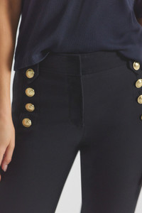 Our iconic cropped twill trouser with gold sailor button details along the hips. Zip fly with button closure, flat front, tonal buttoned belt loops and stitching. The Robertson is made in our best-selling Crosby Twill stretch cotton. The comfortable 2-way stretch cotton twill is wrinkle resistant and lends itself to good stretch and recovery. SKU: TC00101ACR - 96% Cotton 4% Elastane - Imported SIZE & FIT Front Rise Length is 9.25” and Inseam Length is 27.5”, based on a size 2. Model is 5’9.5” wearing a size 2. This item fits true to size. FEATURES & DETAILS - Dry clean only - Form fitting with a slim fit from the waist through the thigh and flares below the knee. - Flat front - Buttoned belt loops - Comfort stretch - Wrinkle resistant