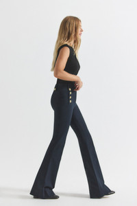 Our cult-favorite flared twill trouser with gold-tone sailor button details along the hips. Zip fly with button closure, flat front, tonal belt loops and stitching. The Robertson is made in our best-selling Crosby Twill stretch cotton. The comfortable 2-way stretch cotton twill is wrinkle resistant and lends itself to good stretch and recovery. SKU: TC00100ACR - 96% Cotton 4% Elastane - Imported SIZE & FIT Front Rise Length is 9.25” and Inseam Length is 33”, based on a size 2. Model is 5’9.5” wearing a size 2. This item fits true to size. FEATURES & DETAILS - Measurements taken from size 4: Inseam: 33", Waist: 29.75", Front rise: 10.5", Leg opening: 22" - Form fitting with a slim fit from the waist through the thigh and flares below the knee.