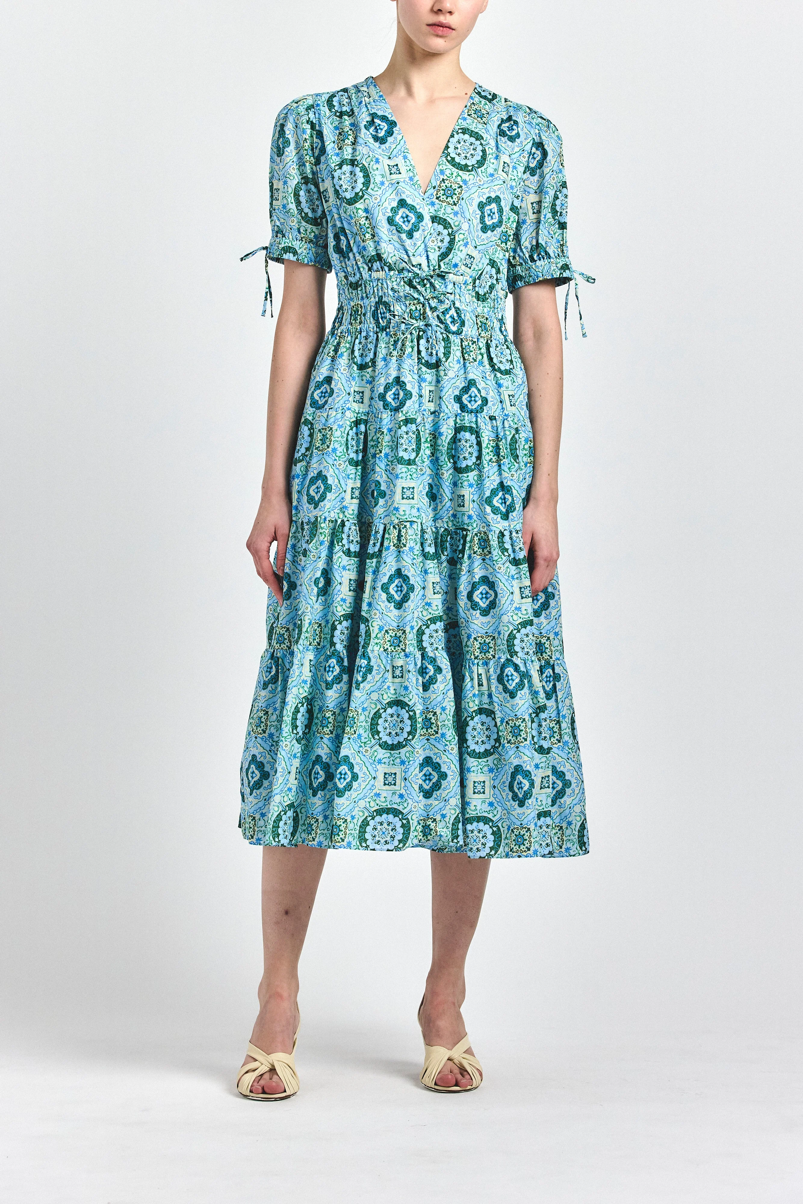 Soft structure meets effortless femininity in this printed midi dress. Designed with a flattering V-neckline, gently puffed sleeves, and a smocked waist with an adjustable lace up tie, the silhouette defines the waist while flowing with ease through the skirt. Rendered in a layered blue medallion print, this piece brings a refined, artisanal feel to everyday dressing. SKU: TCOP5266VLP - 100% Cotton | Lining: 100% Cotton - Imported SIZE & FIT Length from shoulder to hem 50" |Shoulder 14" |Waist 28 1/4" |Bust 36" | Hips 44", based on a size S. This style runs true to size. FEATURES & DETAILS - V-neckline with wrap-inspired front - Short puff sleeves with adjustable tie cuffs - Smocked elastic waistband - Adjustable lace-up front tie at waist - Tiered midi silhouette - Allover medallion print