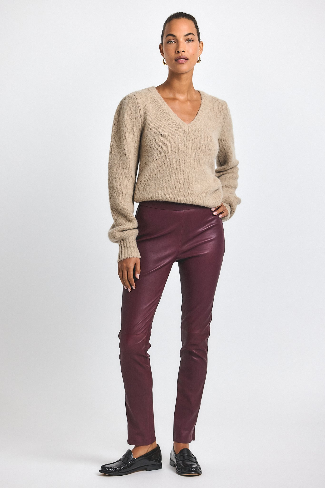 The Thessaly Pant is constructed from a soft, stretch leather. Cut for a skinny and cropped fit, with a mid rise. Features a grosgrain stripe detail and faux welt back pockets. SKU: TF521336STL - 100% Lamb Leather - Imported SIZE & FIT Rise 10.875” | Inseam 28” | Leg Opening Circumference 12.5”, based on a size 2 Our model is 5’10” and is wearing a size 2. This style runs true to size. FEATURES & DETAILS - Dry clean only