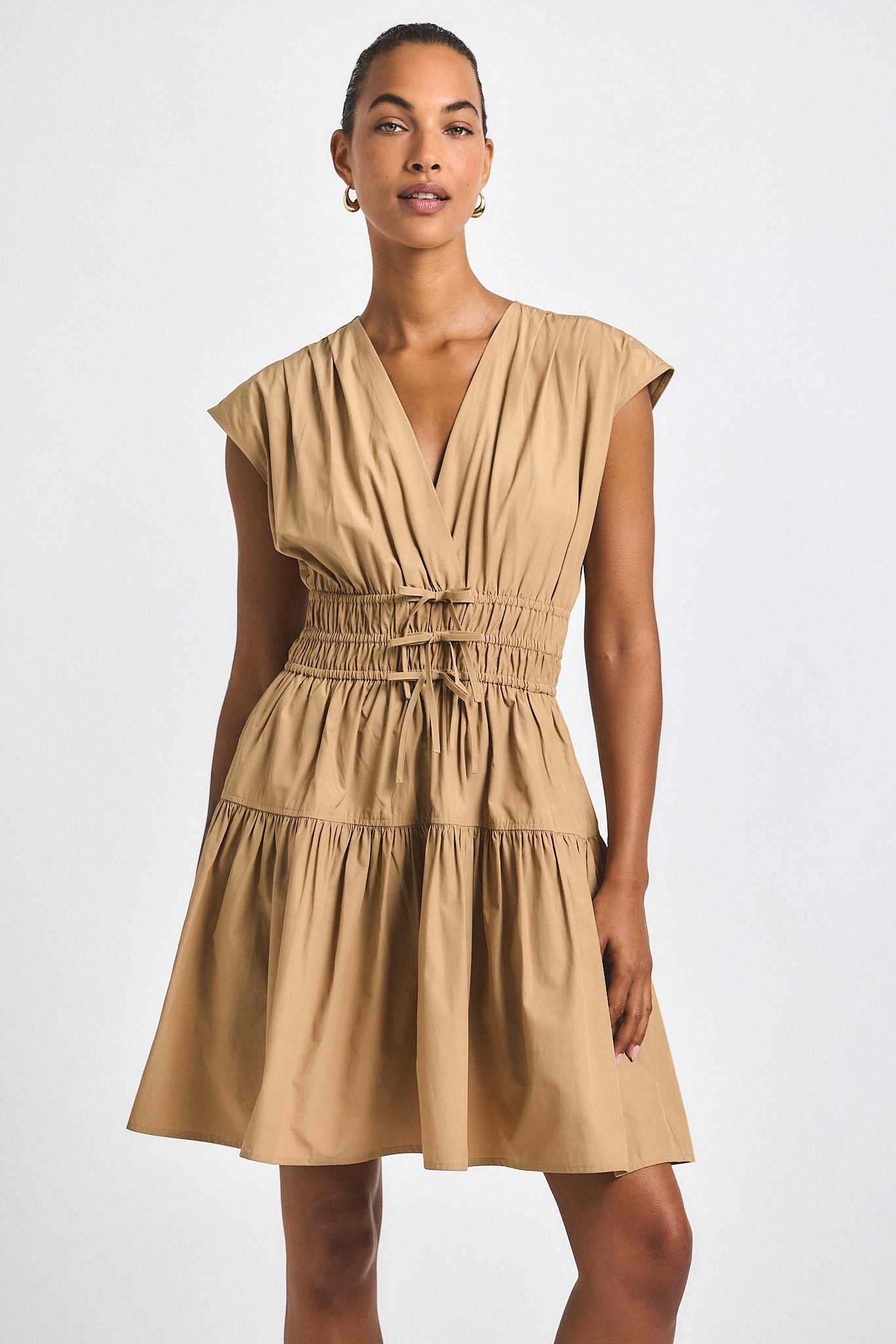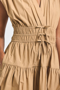 The Tora V-Neck Dress is made from a crisp cotton poplin and cut with a flouncy a-line silhouette. It features pleating throughout with short sleeves, a gathered waist, and three small bows on the front. It falls to a full, tiered skirt with shirring details to accentuate the volume. If smaller busted, please size down. SKU: TF515072PPO - 95% Polyester, 5% Elastine - Imported SIZE & FIT Length from shoulder to hem is 37.5” based on a size 2. Our model is 5’9” and is wearing a size 2. This style runs true to size. FEATURES & DETAILS - Dry clean only