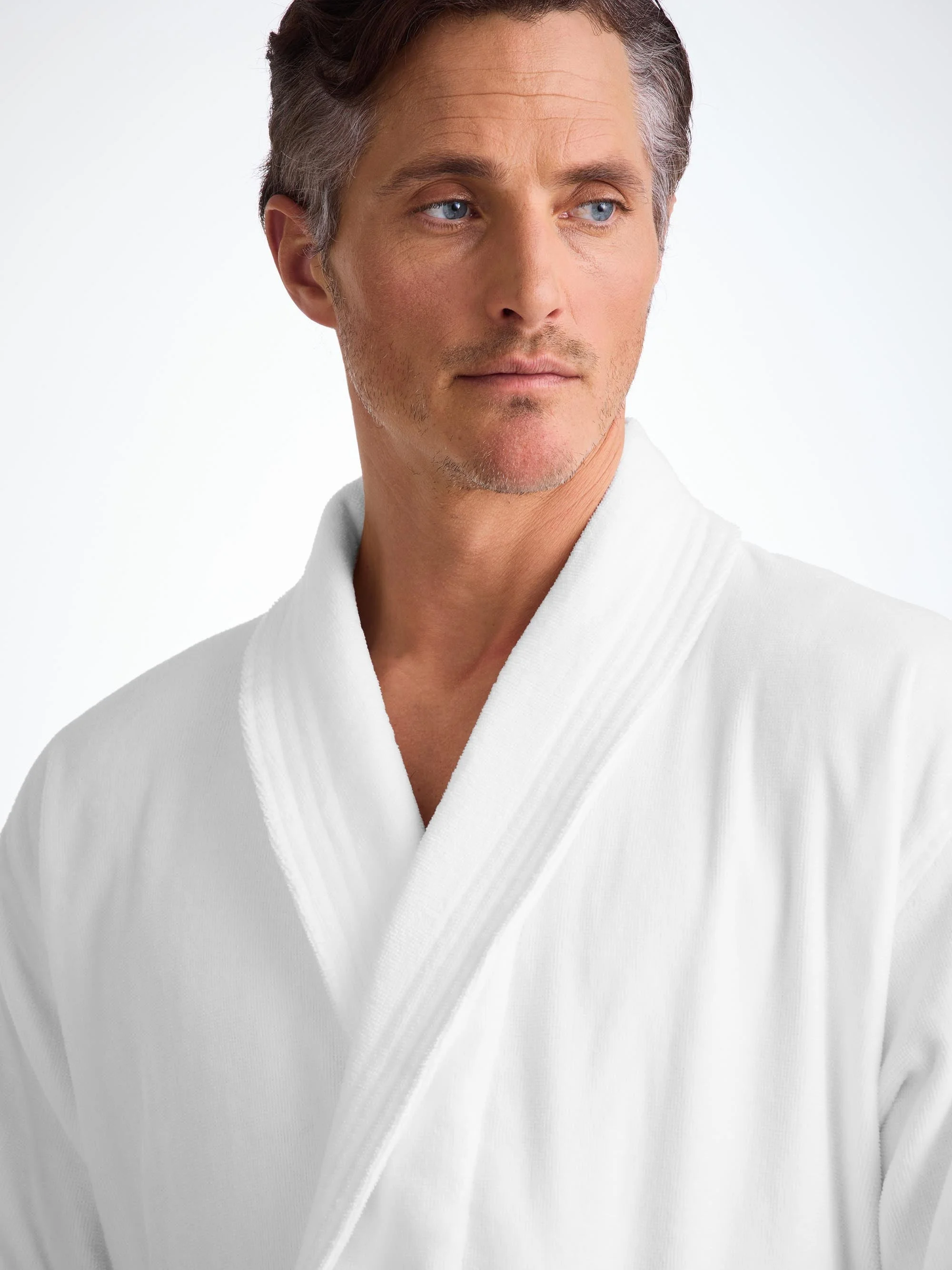 Our Triton bathrobe is a customer favourite, it features a classic shawl collar and two side pockets for practicality while around the house. It's fastened with a fabric tie belt for the perfect fit. A cut back yarn on the outside gives it the soft velour finish, with a rich and lustrous appearance, whilst the looped 'towelling' yarns inside are designed to maximise absorption of water. You'll be dry and comfortable in no time. To make it truly special , we can personalise your bathrobe with initials or a motif. Read more about our personalised services here . The model is 6'2" / 188.5cm tall. He wears a size Medium. Click here for our full range of Men’s Dressing Gowns. PRODUCT DETAILS Material: Pure Cotton Fabric Weight: Medium Fabric Type: Velour Gender: Men's Colour: White Pattern: Plain Sleeve Length: Long Sleeve Season: CLA Country of Origin: Turkey Composition: 100% Cotton Fit: Relaxed Fit Item Number: 5700-TRIT010WHI