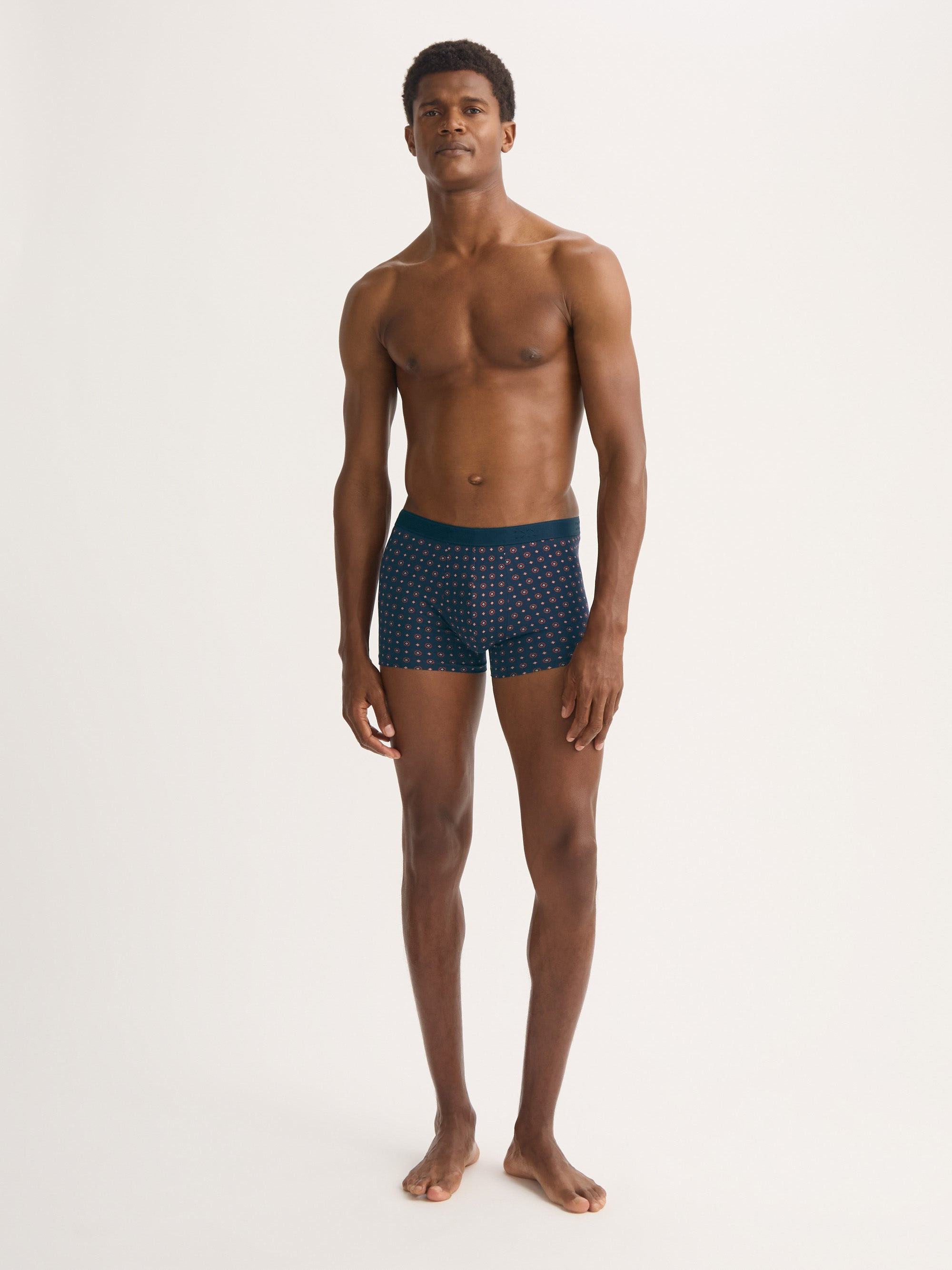 Streamlined fit with a heritage-inspired design. Celebrating 100 years of Derek Rose, these men's boxer briefs feature a classic foulard rose motif in refined navy and red—a timeless symbol reimagined for modern loungewear. Cut with a shorter leg and closed front, the design offers a sleek, supportive fit. Manual welt hems and minimalist lines provide smooth body contact, while the fabric-lined waistband ensures lasting comfort. Crafted from a soft cotton blend with stretch, the fabric delivers excellent fit, flexibility and durability, complemented by superfine threads for an extra-soft touch. Everyday underwear elevated with heritage detail and modern craftsmanship. Model is 6’2” / 189cm, wearing a size Medium. PRODUCT DETAILS Composition: 92% Cotton 8% Elastane Fabric Weight: Light Pattern: Print Country of Origin: Portugal Item Number: 8615-ROSE008NAV