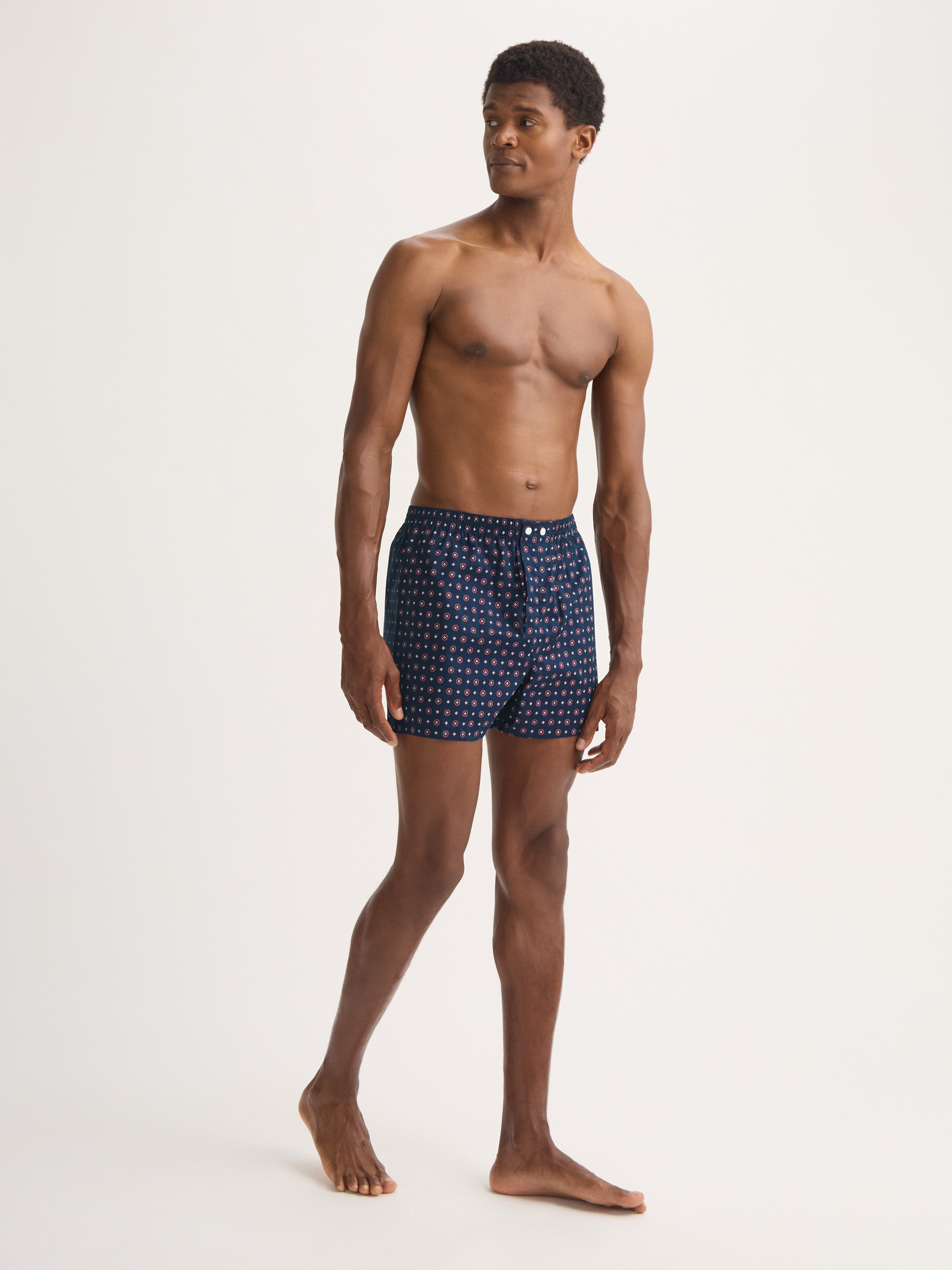 Relaxed fit with a heritage-inspired design. Created to celebrate 100 years of Derek Rose, these boxers feature a hand-drawn foulard rose motif, colored in timeless menswear shades. A refined print on a classic silhouette, they bring subtle elegance to everyday essentials. Crafted from our signature cotton batiste, the fabric is soft, breathable and lightweight—keeping you cool and comfortable throughout the seasons. Designed in our classic fit, they offer a generous cut with a smooth back panel that removes the central rear seam for added comfort. A fully elasticated waistband and traditional two-button fly, inspired by our heritage pajama styles, provide adjustability and ease. Perfect for those who prefer relaxed coverage with enduring softness, these boxers combine practicality with timeless style. Model is 6’2” / 189cm, wearing a size Medium. PRODUCT DETAILS Composition: 100% Cotton Fabric Weight: Light Pattern: Print Country of Origin: Czech Republic Item Number: 6000-NELS107NAV