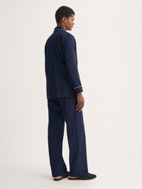 Lightweight softness with a timeless star motif. These men's pajamas feature a simple starburst motif, rotary printed on a soft cotton base for a refined yet playful finish. The navy blue design is classic and versatile, making it a stylish choice for year-round wear. Made from ultra-fine cotton batiste, the fabric is lightweight, breathable and luxuriously soft—perfect for cool, comfortable sleep in any season. Durable and easy to care for, it retains its softness and shape wash after wash. Based on a design first created by Mr Derek Rose, our classic fit pajamas have been refined for decades for ultimate comfort. The pajama top includes a classic collar and three pockets, while the pants feature an adjustable two-button waistband with open fly. Elasticated sides ensure a smooth, relaxed fit at the front and back. Add a personal touch with monogramming, a motif or a secret message. Model is 6’2” / 189cm, wearing a size Medium. PRODUCT DETAILS Composition: 100% Cotton Fabric Weight: Light Pattern: Print Sleeve Length: Long Sleeve Country of Origin: Czech Republic Item Number: 5005-NELS108NAV