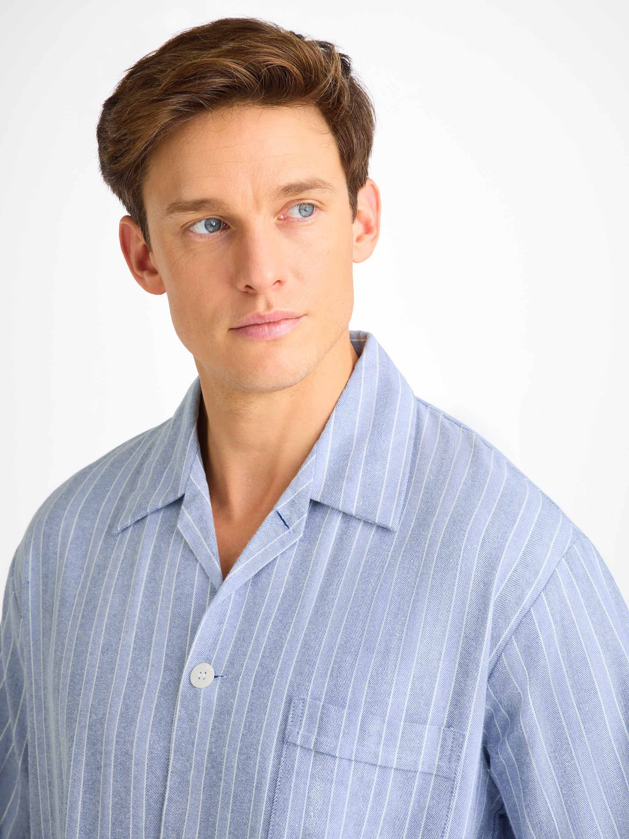 Our Arran pyjamas are styled for a relaxed and comfortable fit for pure free time bliss. They feature a three-pocket jacket, classic collar and adjustable two-button waistband. Elasticated sides on the trousers mean the front and back are flat for your comfort. If you are going to live in your pyjamas this season, then the Arran is for you. Their super-soft, winter-weight brushed cotton makes them the perfect choice for the colder time of year - they really do feel as good as they look! To make it truly special, we can personalise your garment with initials or a motif. Read more about our personalised services here . The model is 6'1" / 185cm tall with waist size 31” / 79cm, chest size 38” / 96cm. He wears a size Medium. PRODUCT DETAILS Material: Pure Cotton Fabric Weight: Heavy Fabric Type: Flannel Gender: Men's Colour: Mid Blue Pattern: Stripe Sleeve Length: Long Sleeve Season: CLA Country of Origin: Czech Republic Composition: 100% Cotton Fit: Relaxed Fit Item Number: 5000-ARRA020BLU