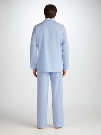 Designed for your free time with a relaxed fit, they're perfect for lounging day to night. Featuring a three pocket jacket, classic collar and adjustable two-button waistband. Elasticated sides on the trousers mean the front and back are flat for your comfort. Customise your pyjama set with your initials for a unique personalised touch. Classic and versatile. The James is a lightweight and breathable pure cotton fabric with a blue and white striped design. It's made to offer the highest level of comfort and relaxation all year round. T o make it truly special, we can personalis e your garment. We offer a range of options including monogramming, motifs, and secret messages. Read more about our personalised services here . The model is 6’1” / 188cm tall with waist size 31” / 80cm, chest size 39” / 101cm. He wears a size Medium. PRODUCT DETAILS Material: Pure Cotton Fabric Weight: Light Fabric Type: Regular Gender: Men's Colour: Light Blue Pattern: Stripe Sleeve Length: Long Sleeve Season: CLA Country of Origin: Czech Republic Composition: 100% Cotton Fit: Relaxed Fit Item Number: 5005-JAME001BLU